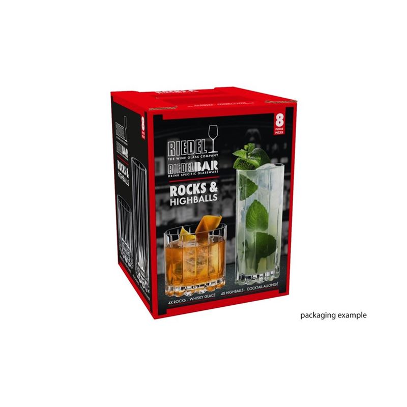 This pack contains 4 RIEDEL Drink Specific Glassware Rocks tumbler and 4 RIEDEL Drink Specific Glassware Highball glasses.