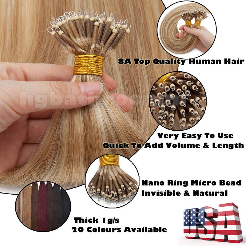 Hair Type US TOP QUALITY ---- 100% Human Hair Nano Ring Micro Tips Bead Link Pre Bonded Remy Hair Extensions Length & Weight Weigth / Strand: 0.5 g Colour #1 - Jet Black