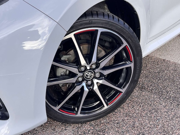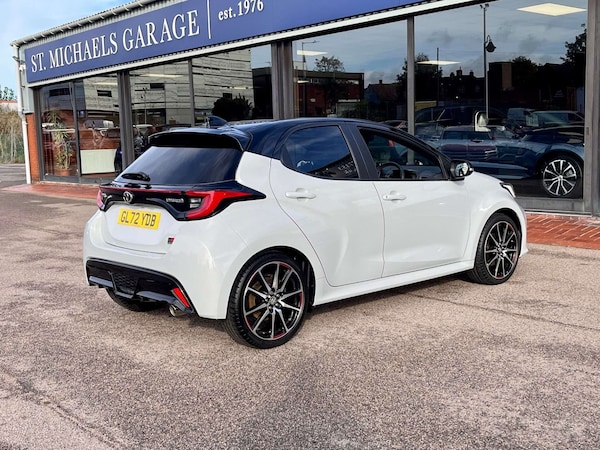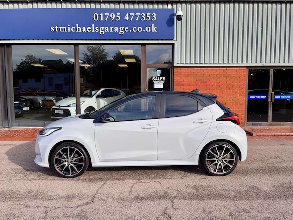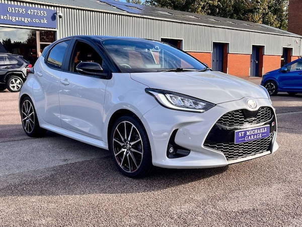 This 2023 Toyota Yaris GR SPORT 1.5L (114 bhp) is listed for sale at St Michaels Garage, Kent. The vehicle has a mileage of 22,500 miles and is priced at £18,495. It features an automatic transmission, hybrid fuel type, insurance group 14E, with a Silver Metallic/Black Pearl colour, 5 doors, and a 1.5L engine size. The vehicle comes with 18"" Matt Black GR Diamond Cut and Polished Alloy Wheels with red flex, an 8.0 inch touch sensitive LCD central multi-function display screen, ABS with EBD and Brake Assist function, air conditioning with duel zone climate control, Auto High Beam Assist, and many more features. It includes FULL SERVICE HISTORY and has had 1 OWNER. The registration number is GL72YDB from the year 2023 (72).