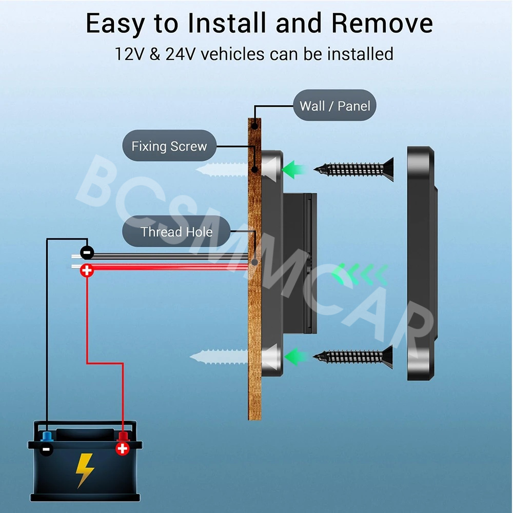 【No Need To Drill A Large Hole】Surface mounted, can be installed on a flat surface without the need for a large hole. Just make a small hole and place the wire inside. Connect the black wire to the negative pole and the red wire to the positive pole. Tighten the screw and cover it.