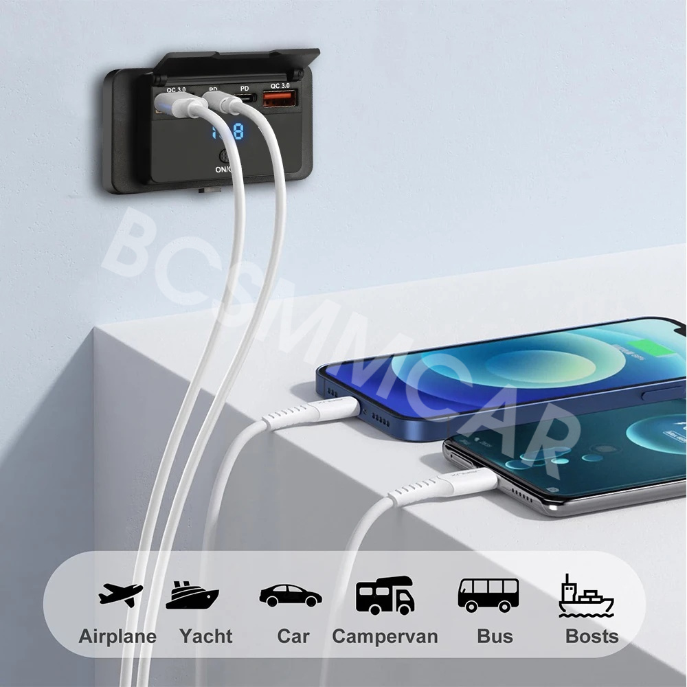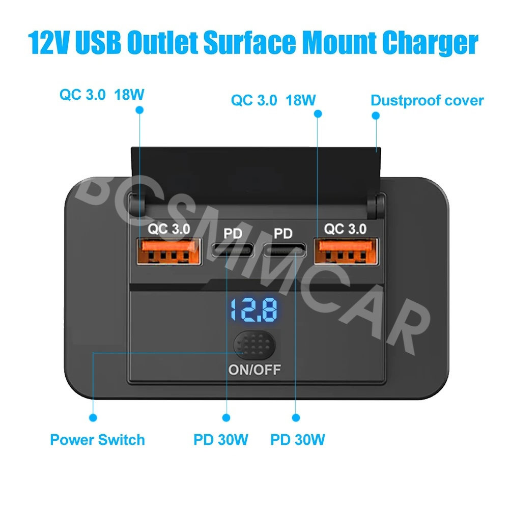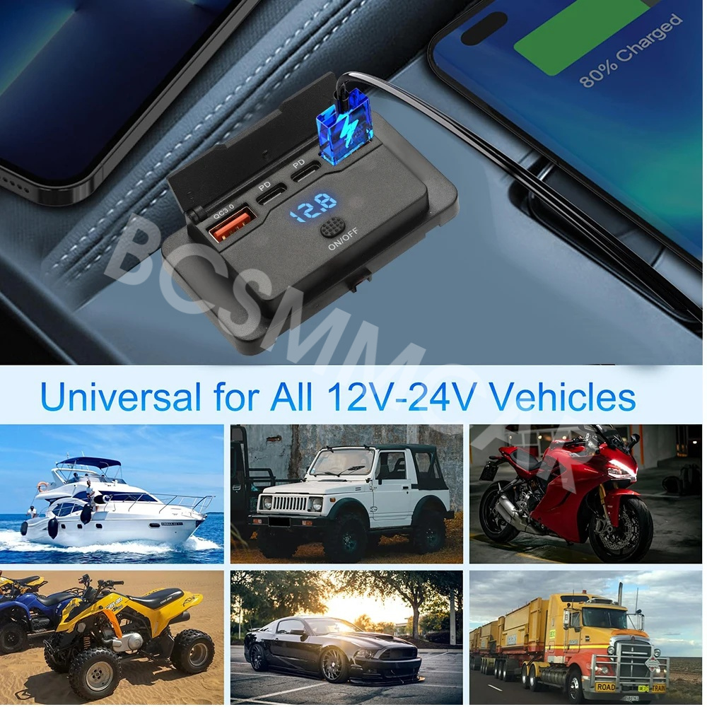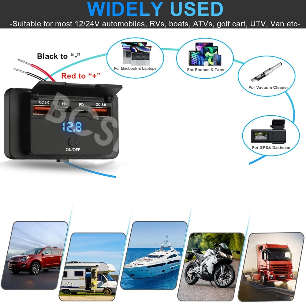 【Dual QC3.0 and Dual PD3.0 Output】Our 12v usb charger multi port is composed of the latest dual QC3.0 USB-A and dual PD3.0 USB-C car sockets, which can quickly charge 4 devices simultaneously without interfering with each other. the PD port has a maximum output of 30W, and the QC port has a maximum output of 18W. The built-in intelligent IC chip can protect your device from the effects of overvoltage, overheating, overload, or short circuit. It is suitable for all 12V-24V vehicles and can be applied to cars, motorcycles, buses, RVs, ships, etc.