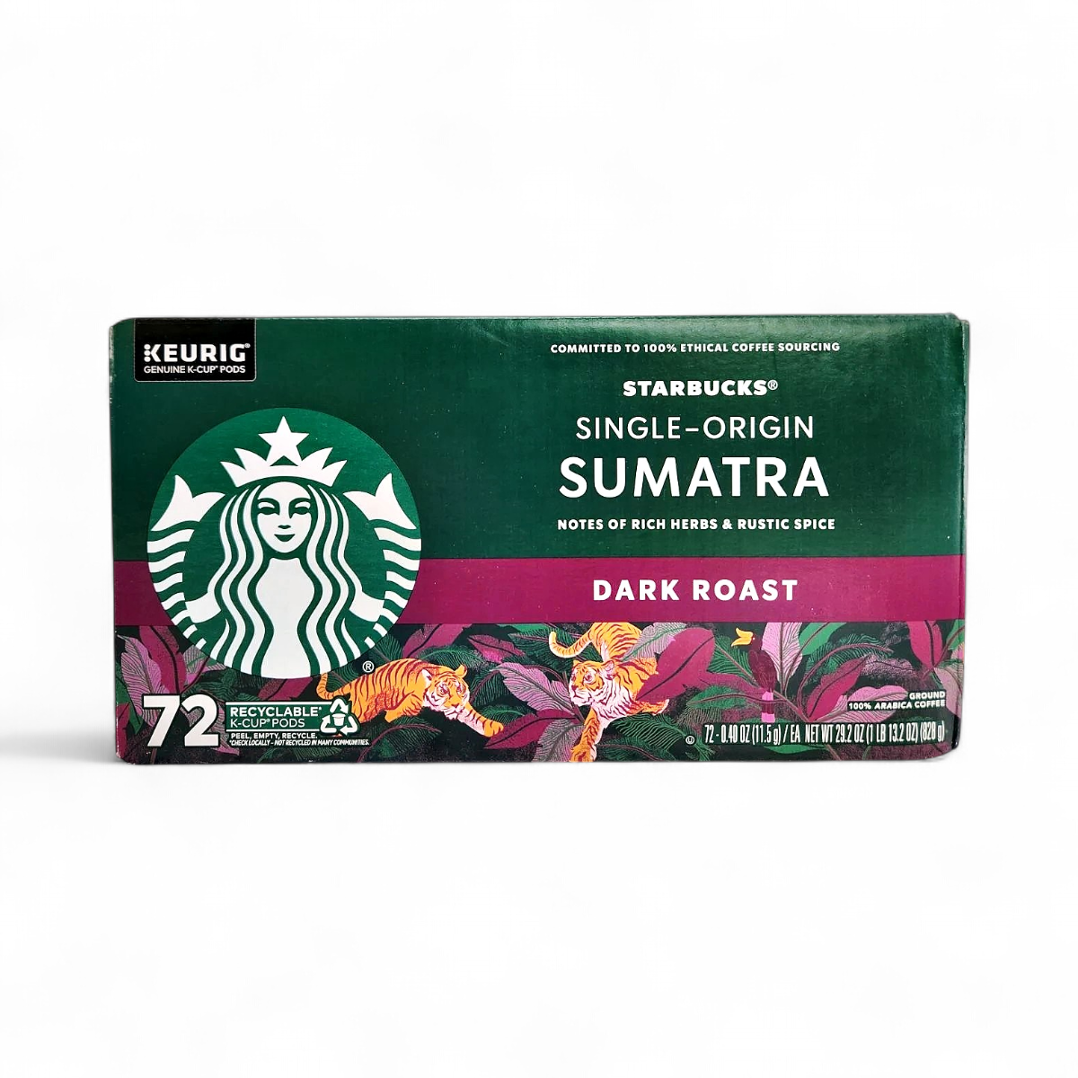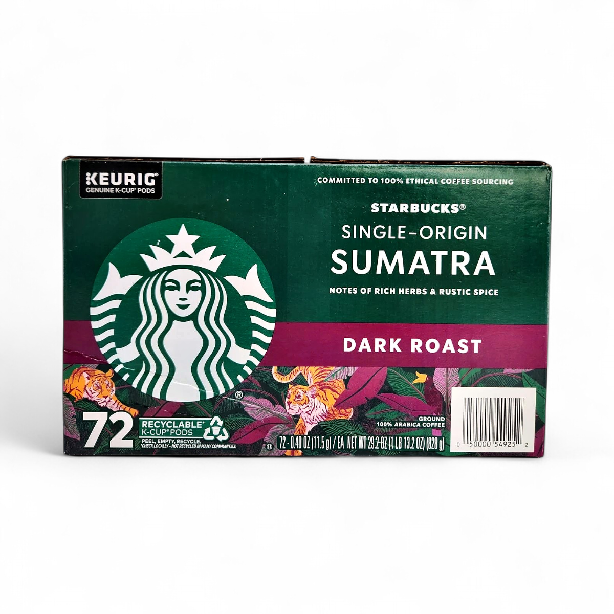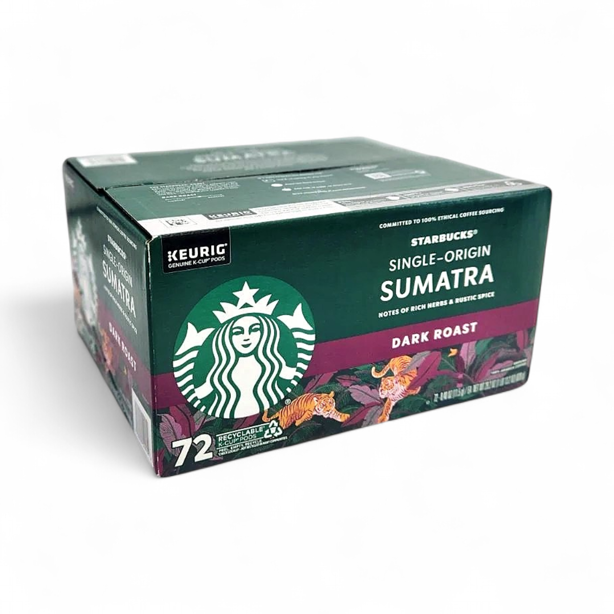 Enjoy the intense, smoky flavor of Starbucks Dark Roast K-Cup Coffee Pods. This large pack features 72 single-serve pods of the popular Single-Origin Sumatra blend, offering a bold and authentic coffee experience at home.