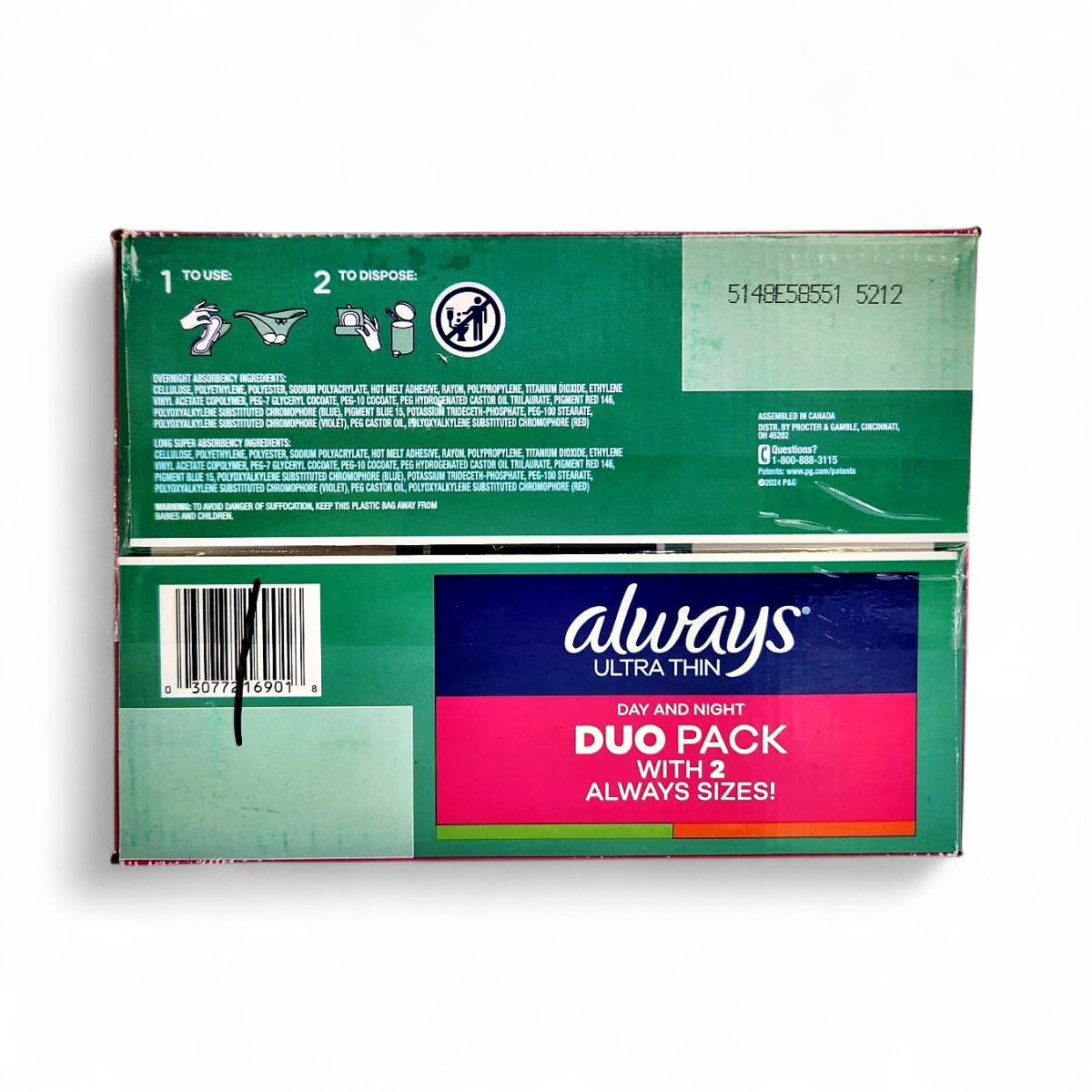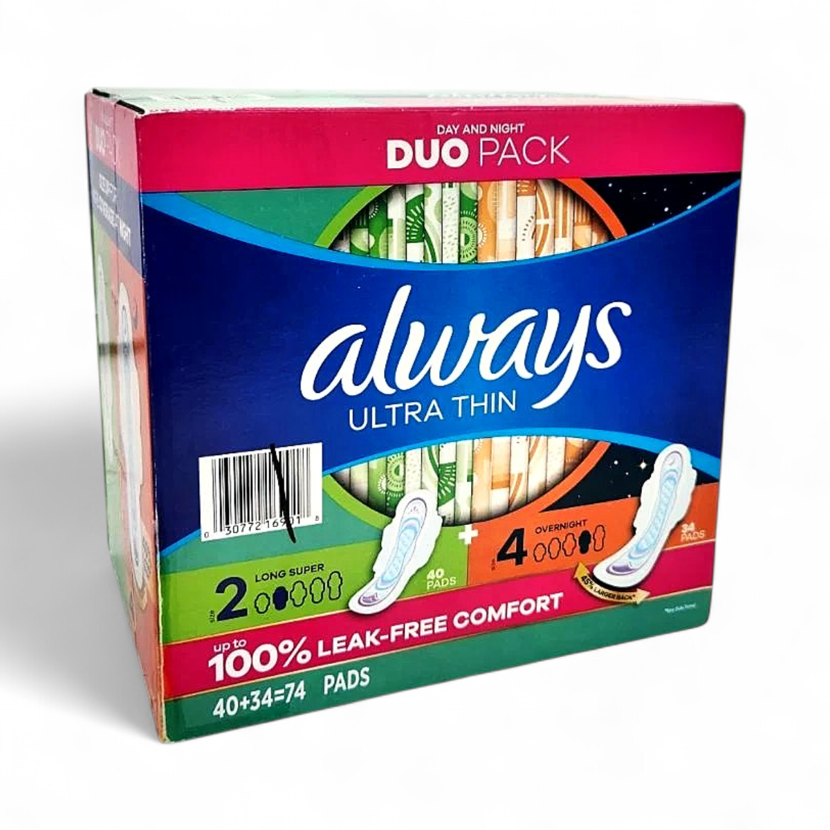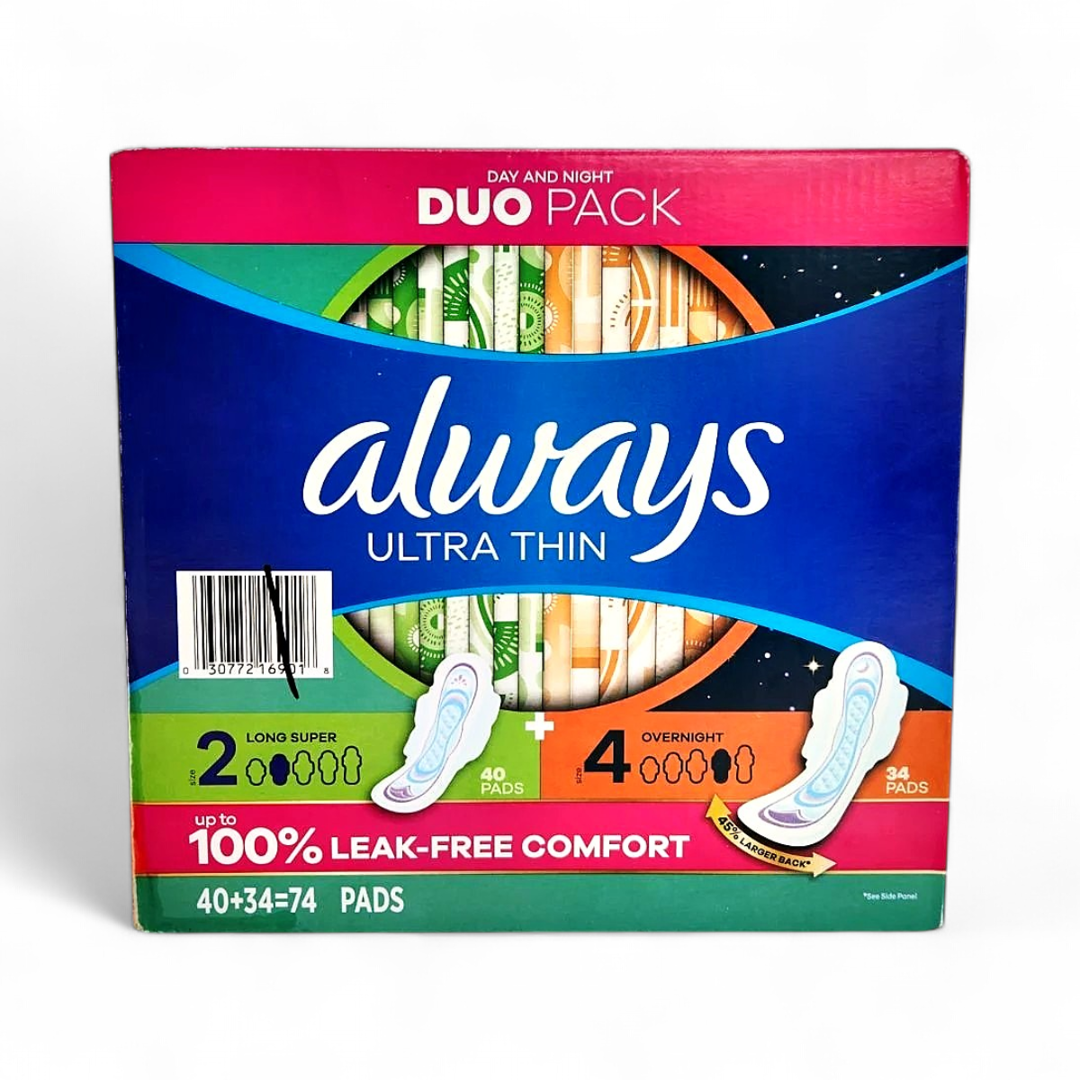This is an Always Ultra Thin Pads Duo Pack offering comprehensive protection for both day and night. This package includes two different sizes to cover all your needs.
