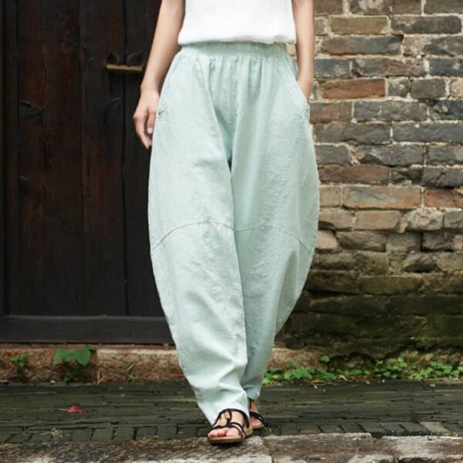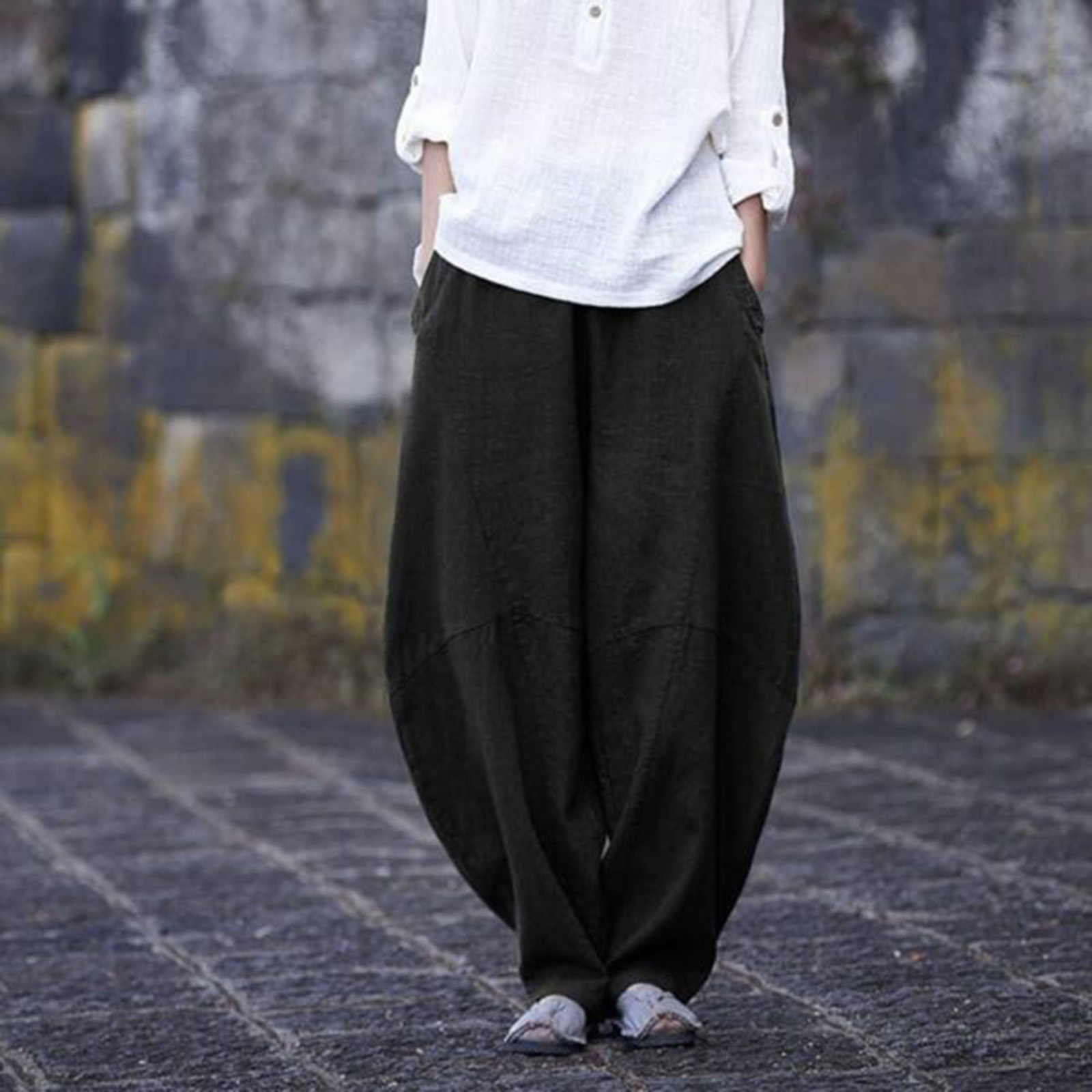 Men Casual Loose Tapered Pants Cotton Linen Elastic Waist Trousers Kung Fu ,.;'