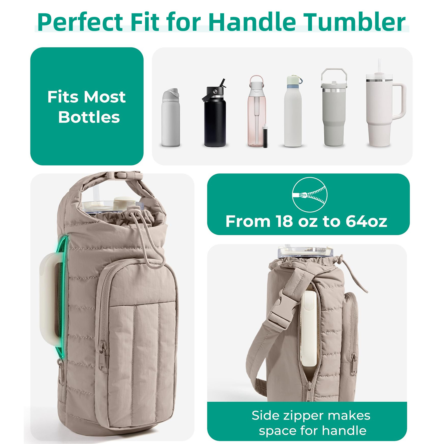18-64 oz: Carry a little or a lot, it’s open. water bottle bag fits various water bottles from 18 oz up to 64 oz, also a side zipper adapted to handle tumbler. Elastic drawstring closurekeep various bottle snug and secure.