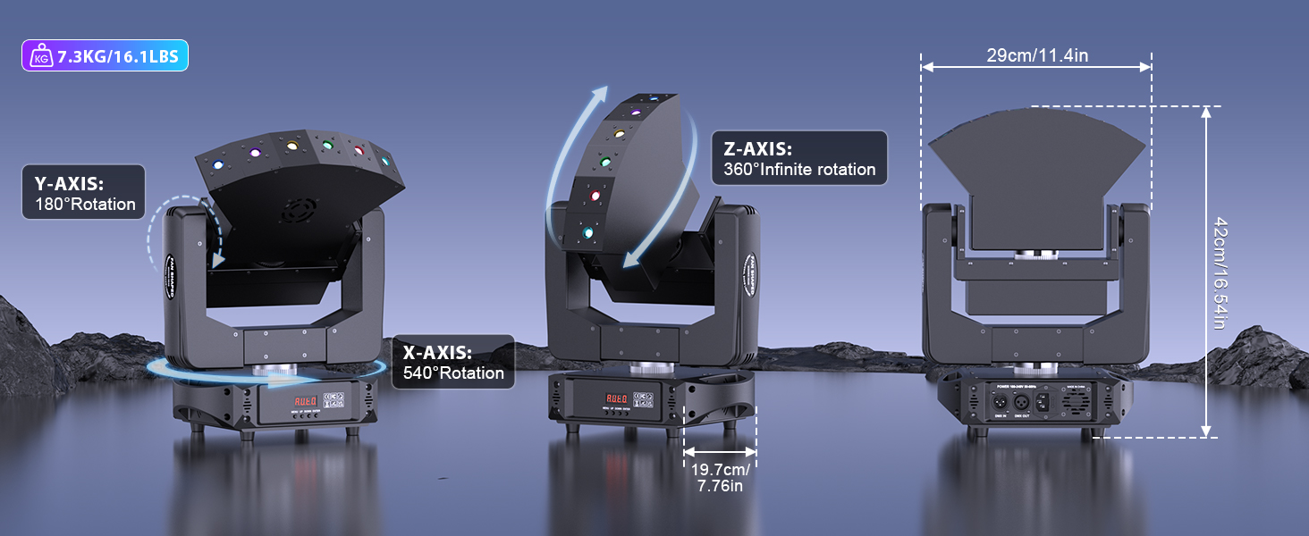 Advanced X-axis (540°), Y-axis (180°), and Z-axis (∞ rotation) deliver ultra-wide coverage, enabling sweeping beam patterns for dynamic stage visuals.