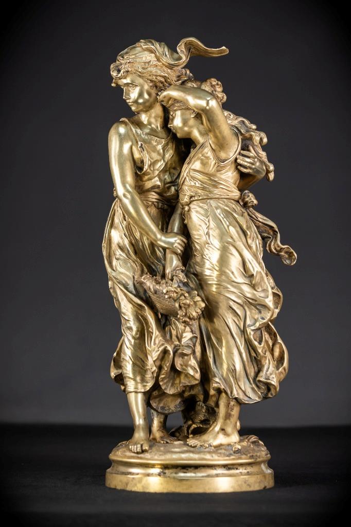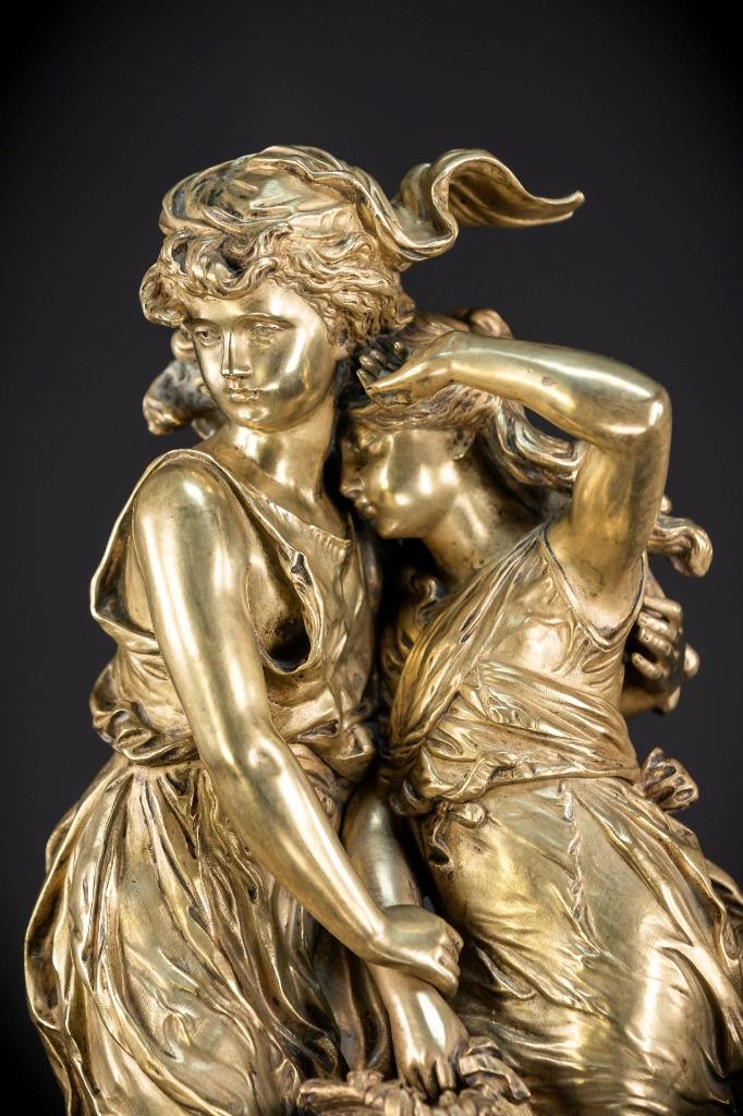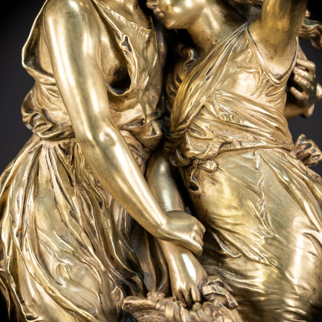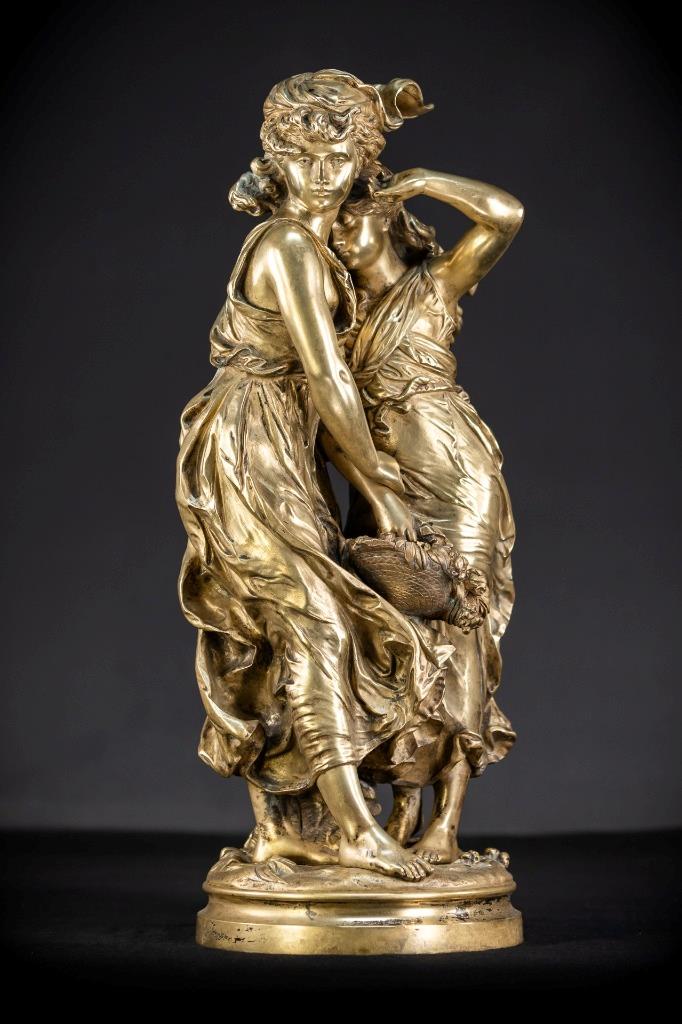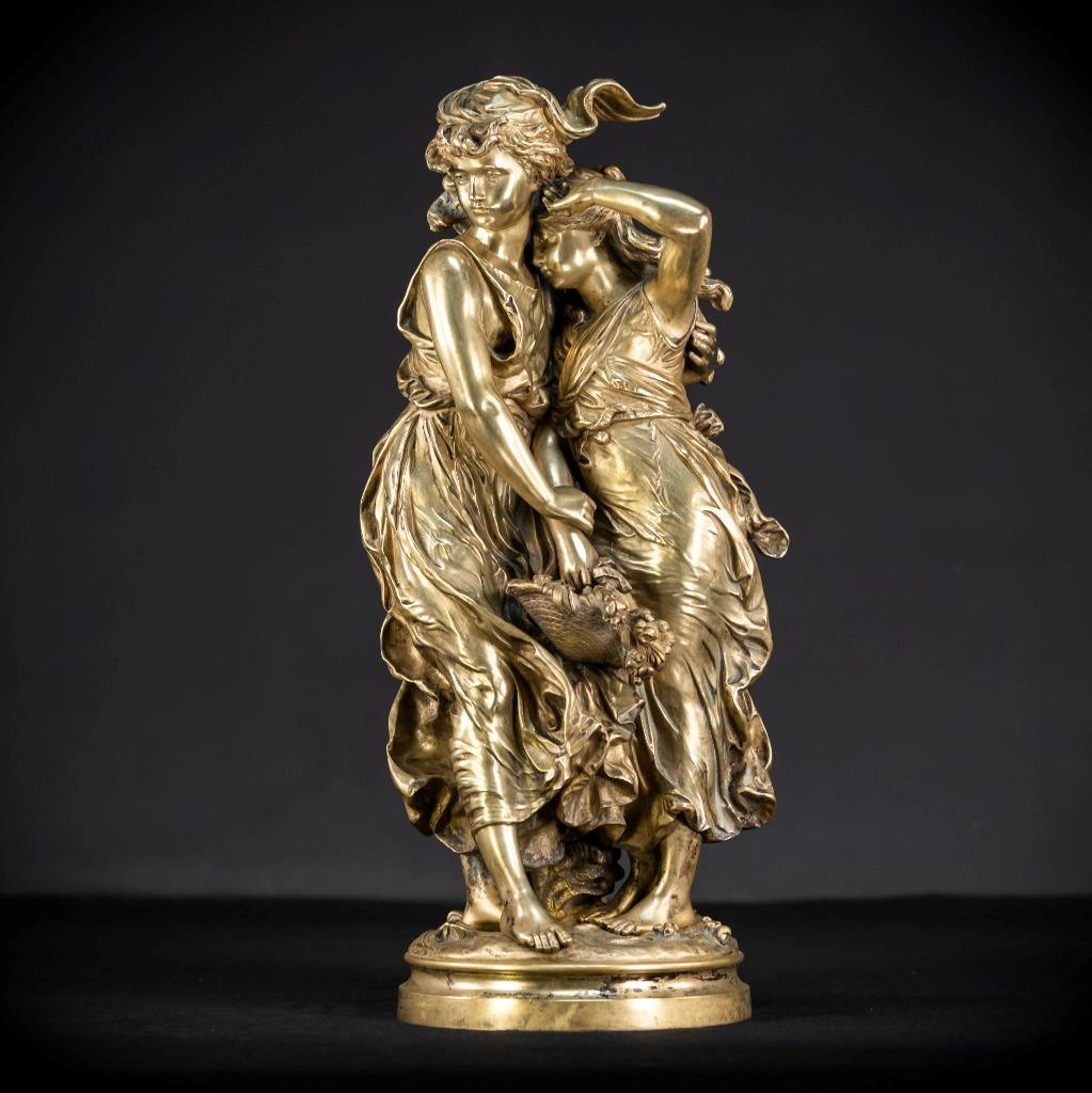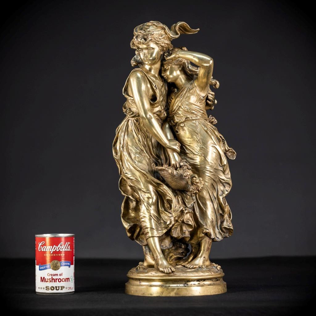 This is an antique bronze sculpture of the Two Sisters With a Basket of Flowers by Hippolyte Francois Moreau, a French sculptor (1832 - 1927). Signed H Moreau on the base. Dates back to the mid-to-late 1800s.