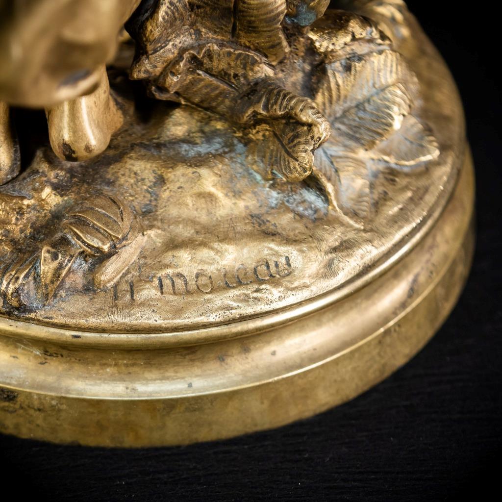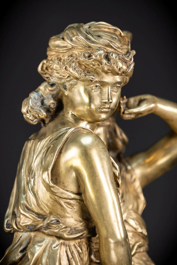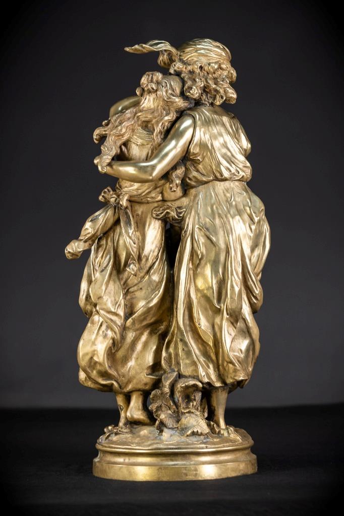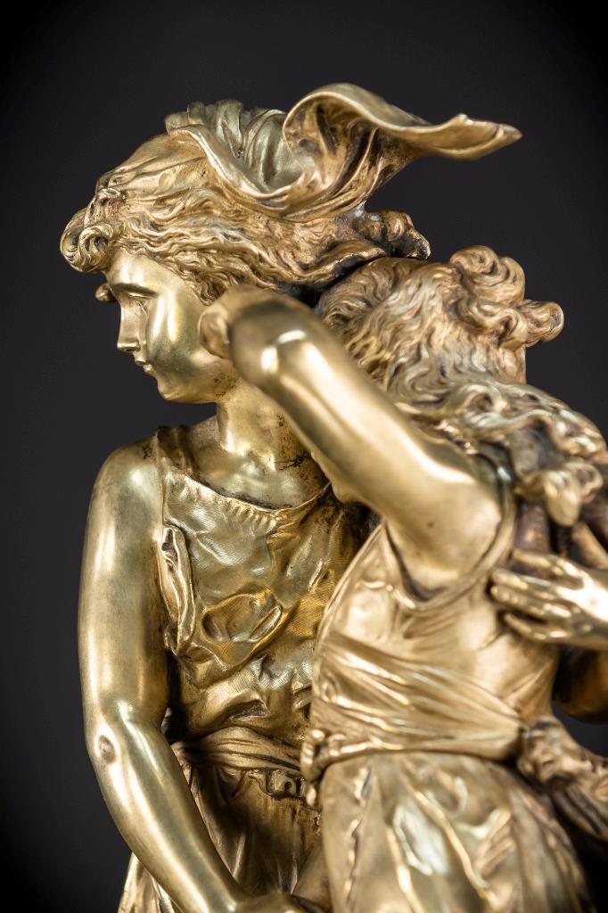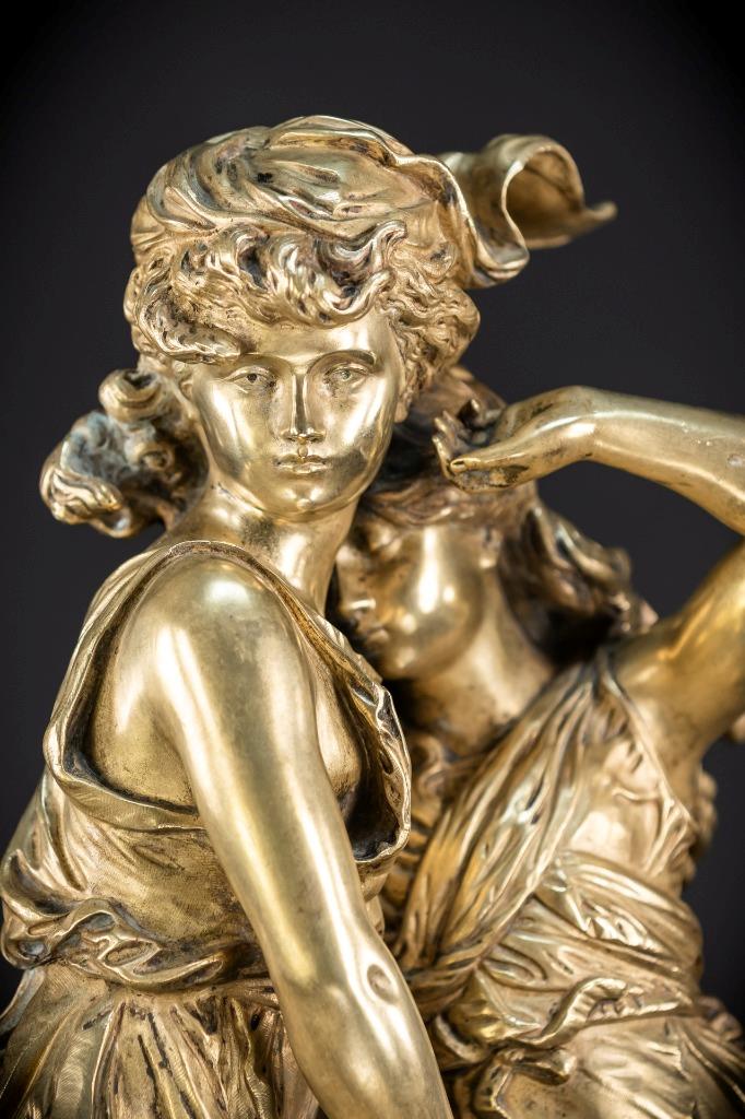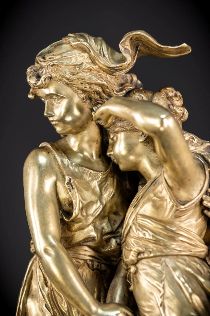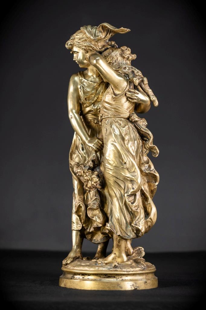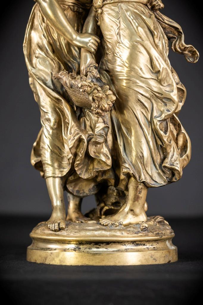 This is an antique bronze sculpture of the Two Sisters With a Basket of Flowers by Hippolyte Francois Moreau, a French sculptor (1832 - 1927). Signed H Moreau on the base. Dates back to the mid-to-late 1800s.