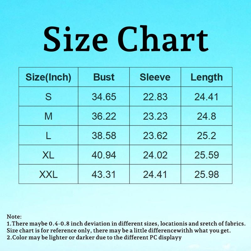 Size:S Bust:88cm/34.65'' Sleeve:58cm/22.83'' Length:62cm/24.41'' Size:M Bust:92cm/36.22'' Sleeve:59cm/23.23'' Length:63cm/24.80'' Size:L Bust:98cm/38.58'' Sleeve:60cm/23.62'' Length:64cm/25.20'' Size:XL Bust:104cm/40.94'' Sleeve:61cm/24.02'' Length:65cm/25.59'' Size:XXL Bust:110cm/43.31'' Sleeve:62cm/24.41'' Length:66cm/25.98''