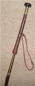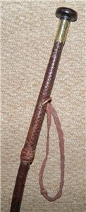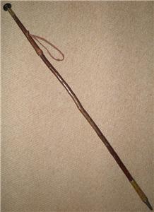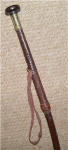 This makhila walking stick has a bovine horn pommel top with a plaited leather handle which unscrews. The handle has a brass loop with a brown plaited leather wrist strap.