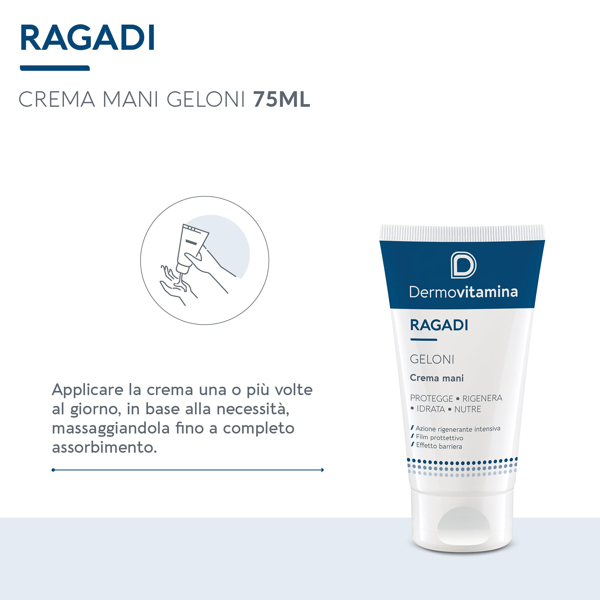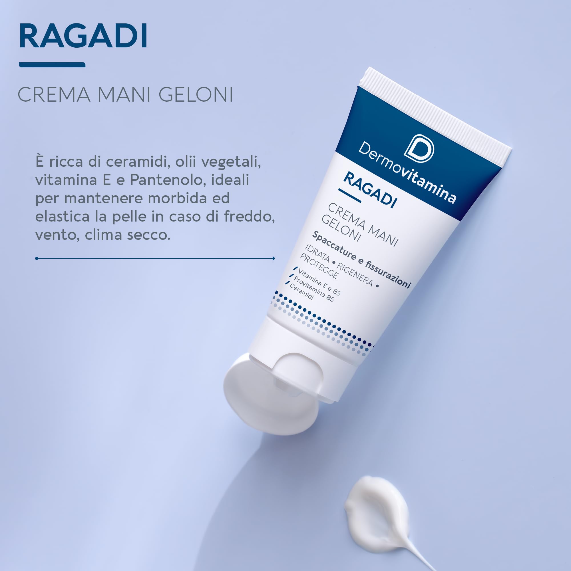 PLUS: Dermovitamina Ragadi Geloni Crema Mani e Piedi ad azione rigenerante intensiva, ideale per proteggere la pelle da aggressioni esterne e ripristinare la barriera epidermica. Crema mani secche e screpolate, perfetta per trattare efficacemente ragadi e geloni con Vitamina E e Pantenolo. La Vitalina E offre un’azione antiossidante e idratante, e il Pantenolo favorisce la rigenerazione della pelle e la mantiene morbida ed elastica. Dermatologicamente testata e metal tested (nickel, cromo, cobalto), è adatta per l'uso quotidiano su mani e piedi.