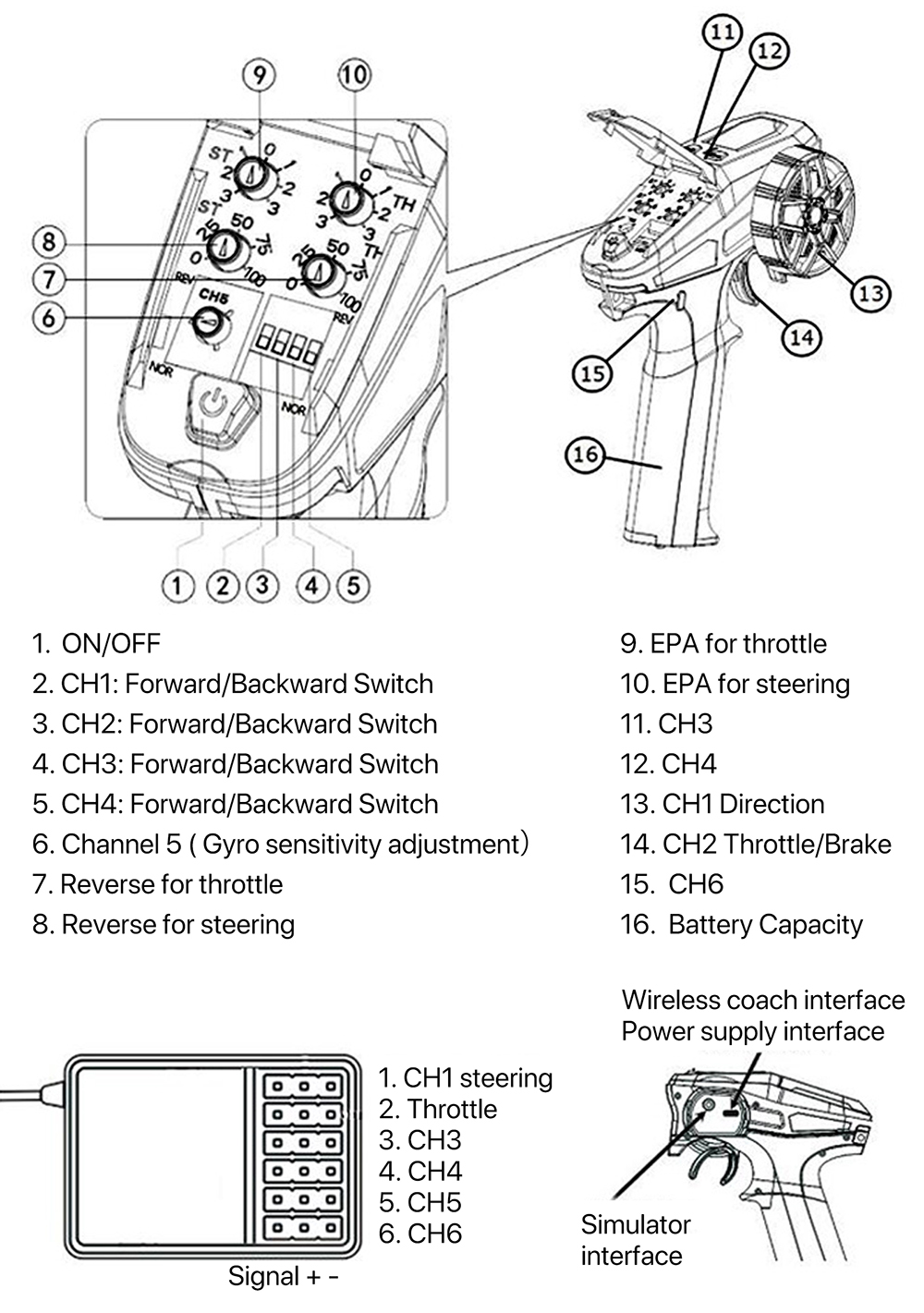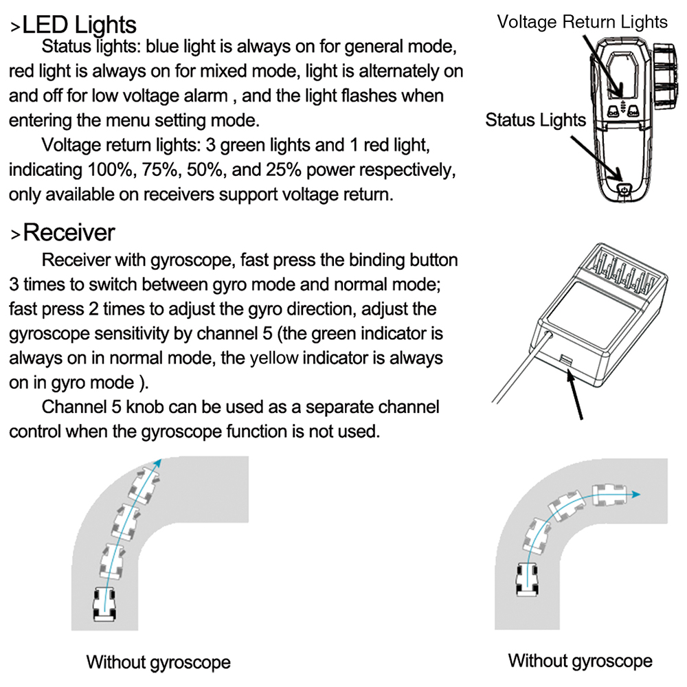 > Receiver integrated gyroscope (optional), ensure that the model goes straight, prevents drifting, and overturning. Sense adjustment is available;