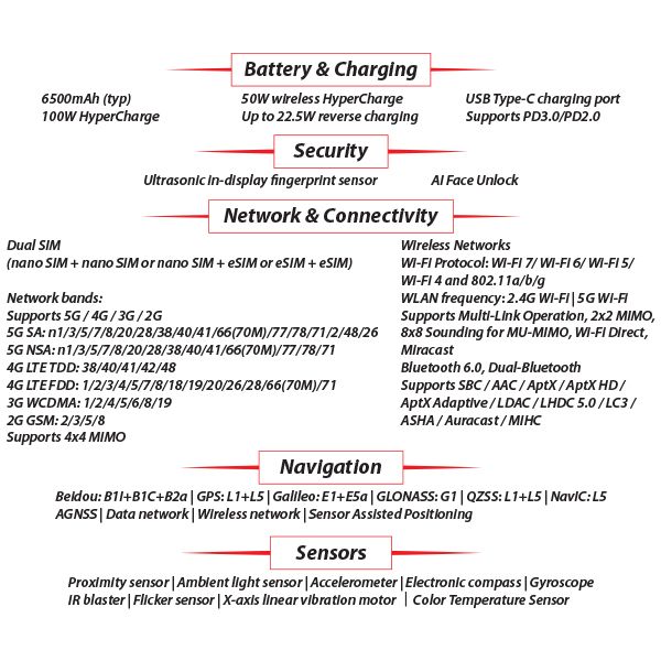 - Fast Charging: 100W wired HyperCharge reaches full charge in 38 minutes;