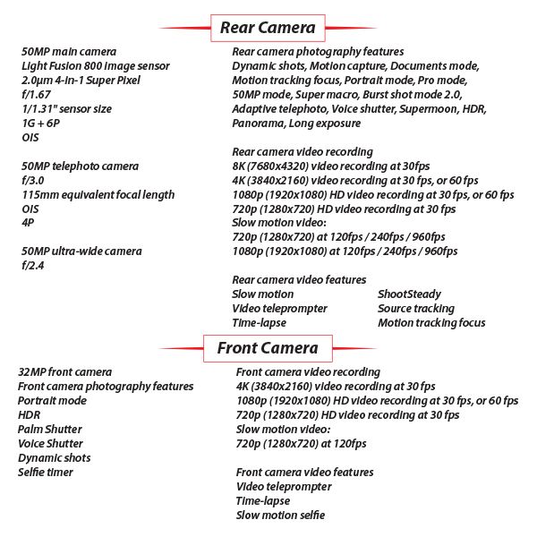 - Front Camera: 32MP with intelligent 0.8x ultra-wide angle for group