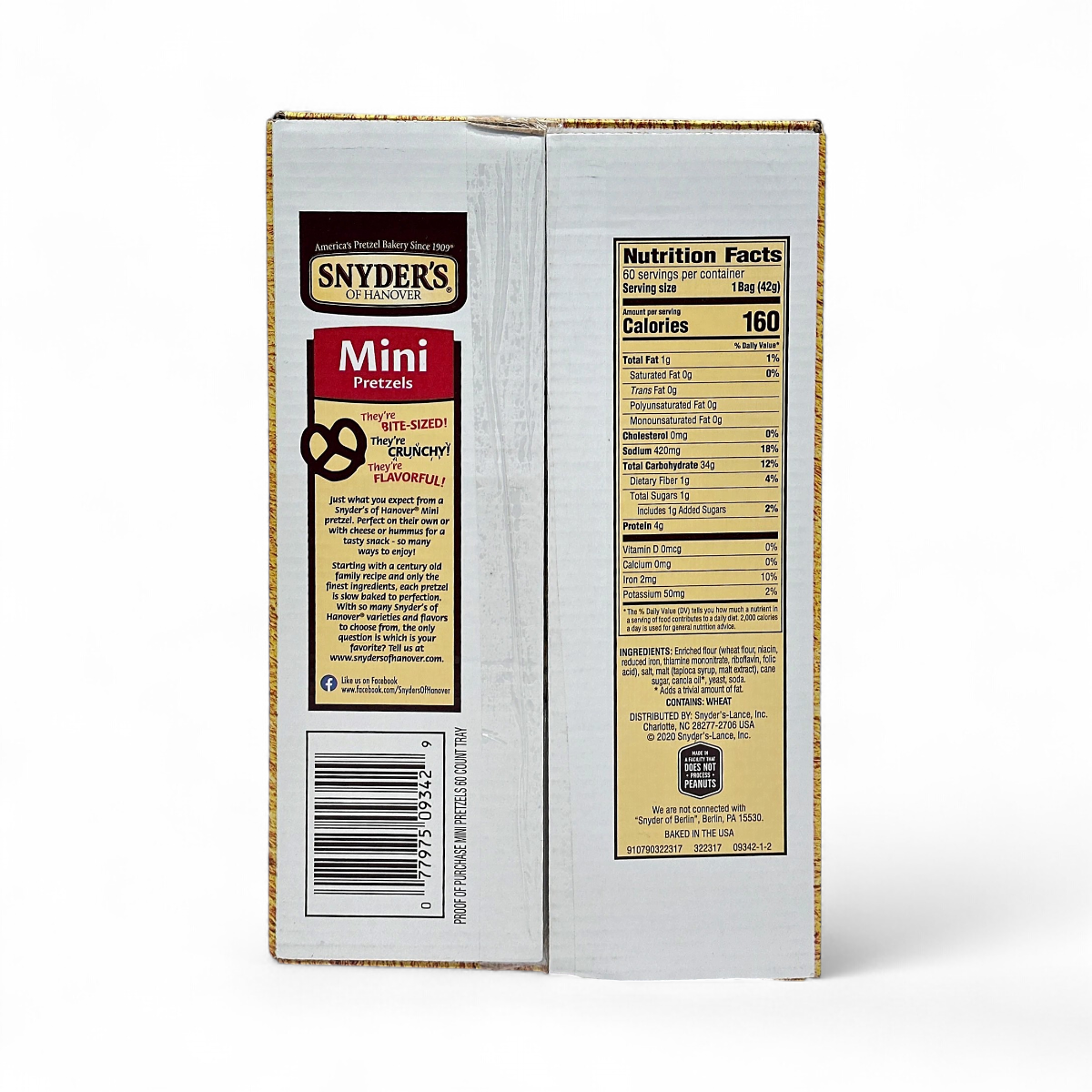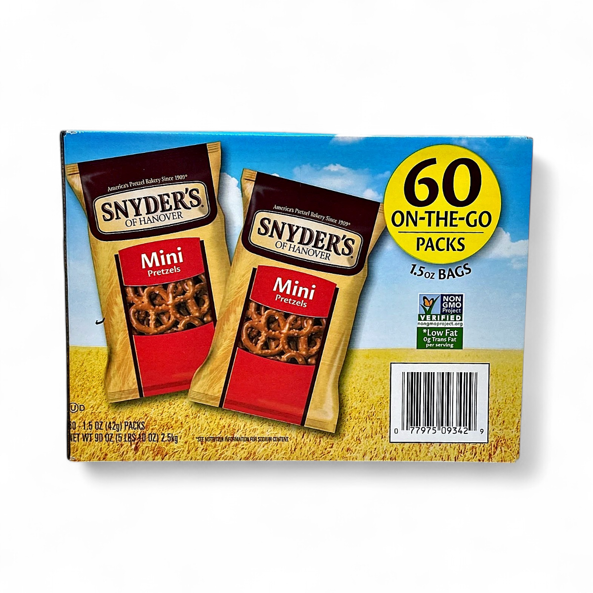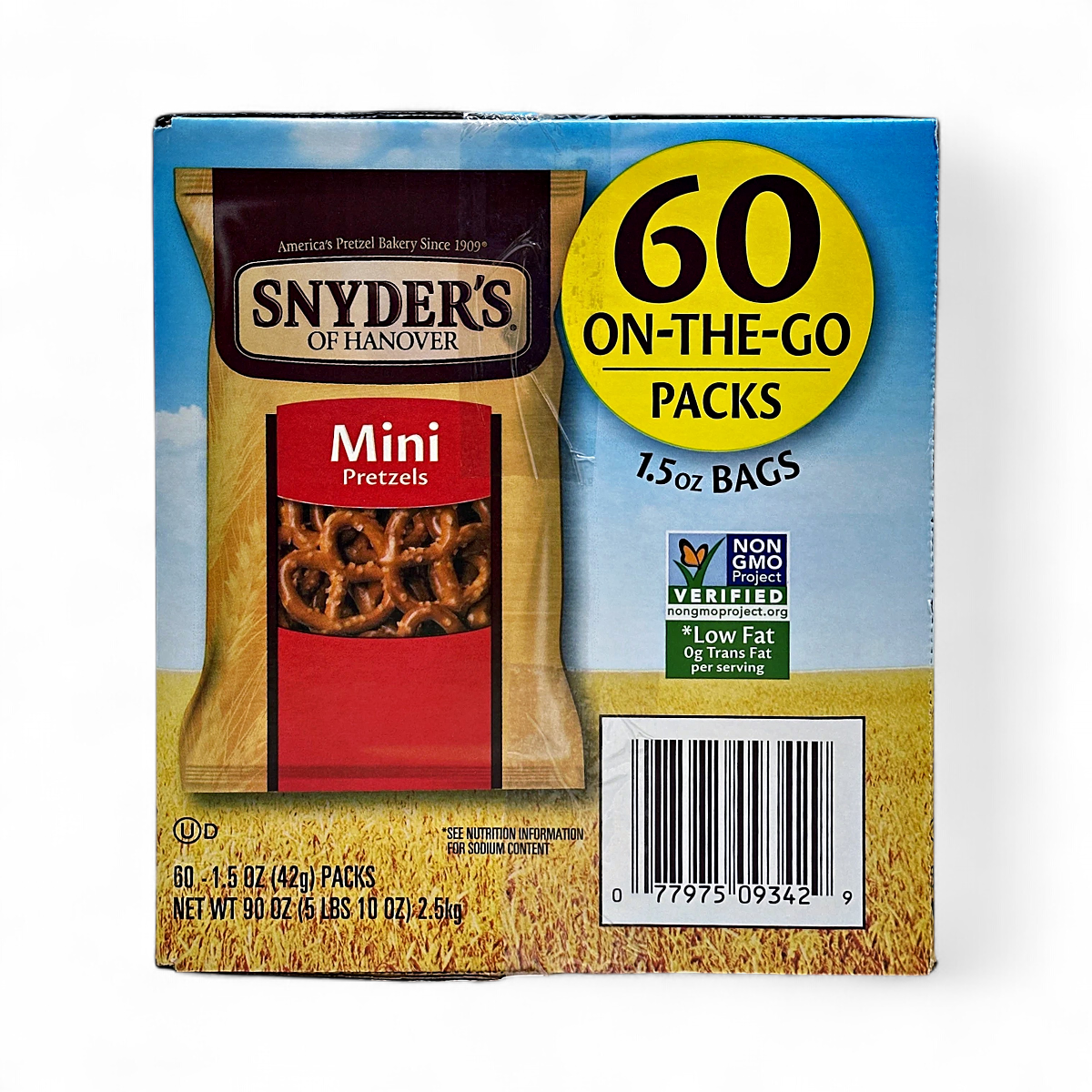This listing is for Snyder's of Hanover Mini Pretzels, offered in a convenient bulk package containing 60 individual On-The-Go packs. Each pack contains 1.5oz of deliciously crunchy mini pretzels, perfect for snacking, school lunches, travel, or stocking up your pantry.