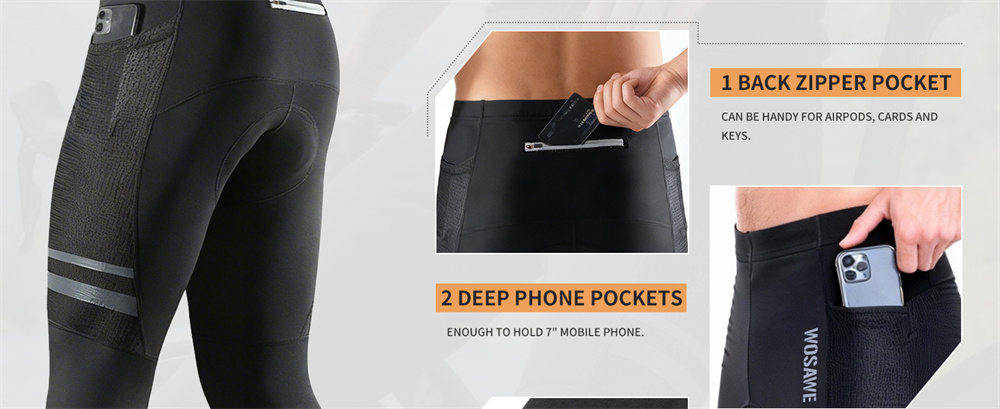 One plug-in pocket on each side of the left and right legs spliced with high-stretch and abrasion-resistant nylon fabric, and a zippered pocket lined with breathable mesh fabric at the back waist for storing mobile phones and other personal items