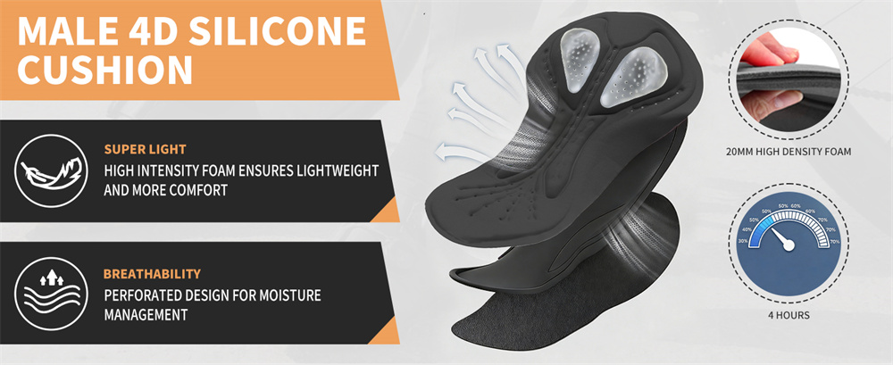 Built-in black 3D sponge silicone cushion with multi-perforated design to reduce friction on the hips while riding