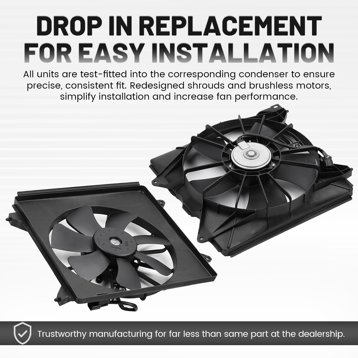 1.Drop in replacement for easy installation.All units are test-fitted into the corresponding condenser to ensure precise, consistent fit. Redesigned shrouds and brushless motors, simplify installation and increase fan performance.
