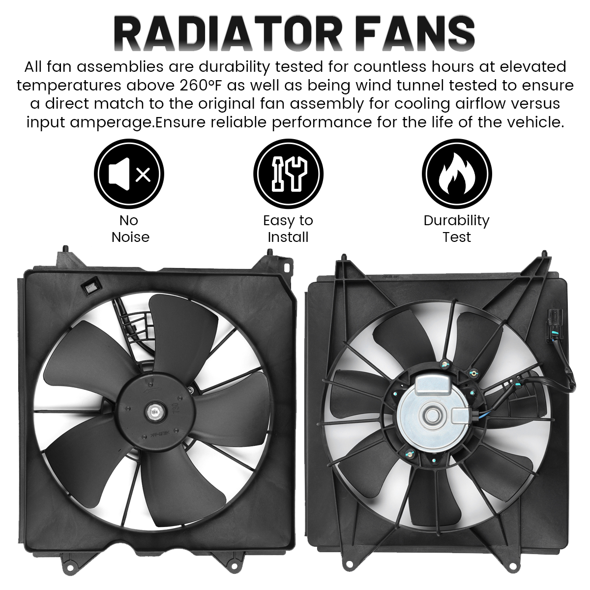 4.All fan assemblies are durability tested for countless hours at elevated temperatures above 260°F as well as being wind tunnel tested to ensure a direct match to the original fan assembly for cooling airflow versus input amperage.Ensure reliable performance for the life of the vehicle.