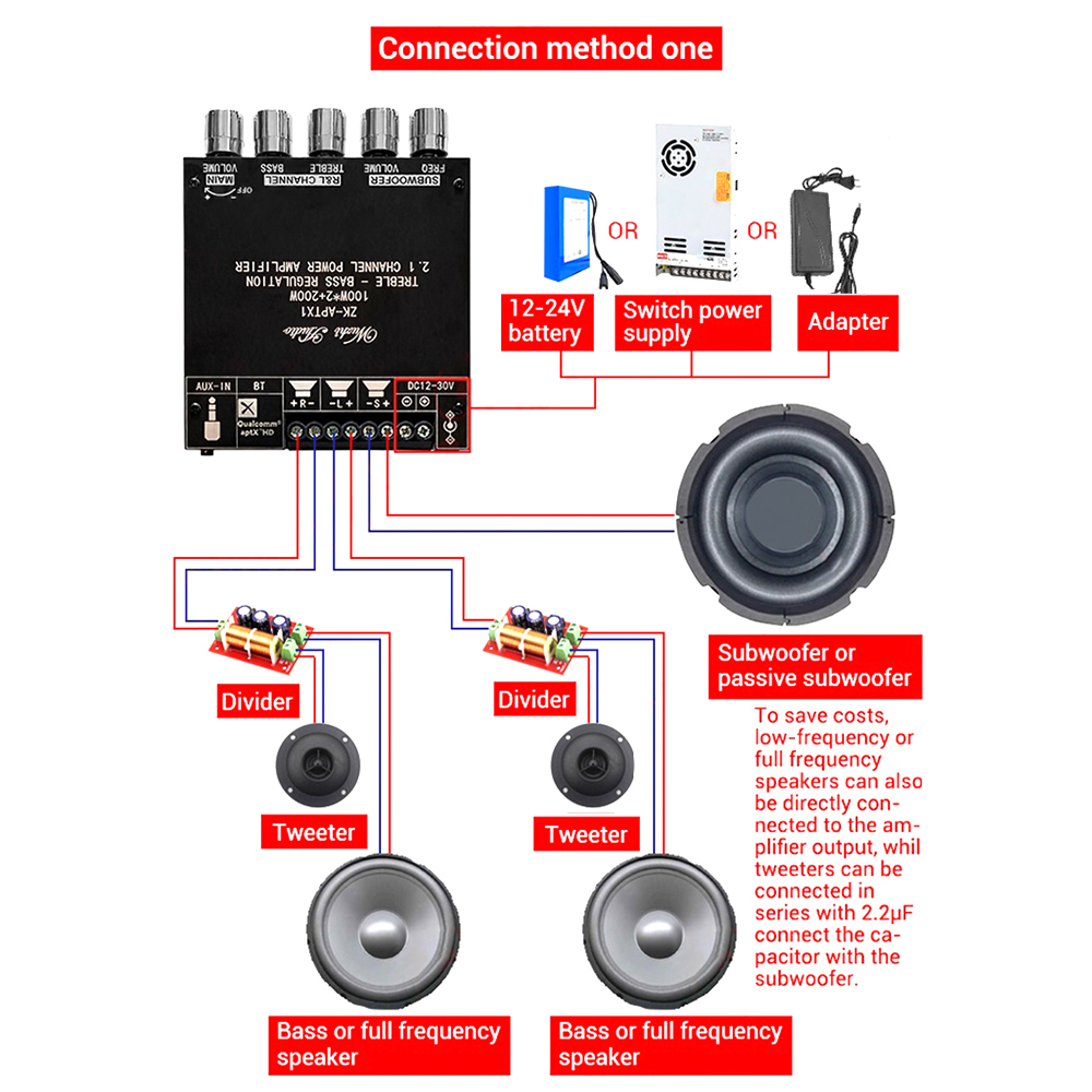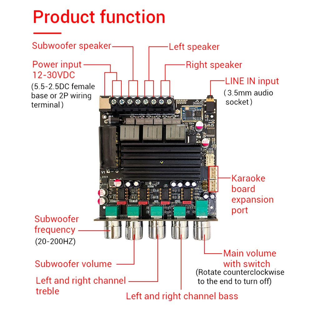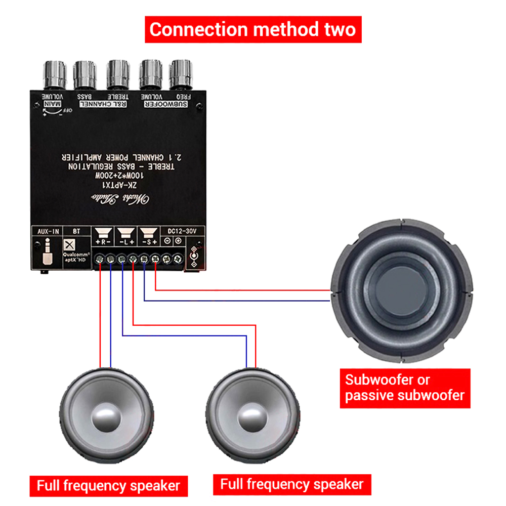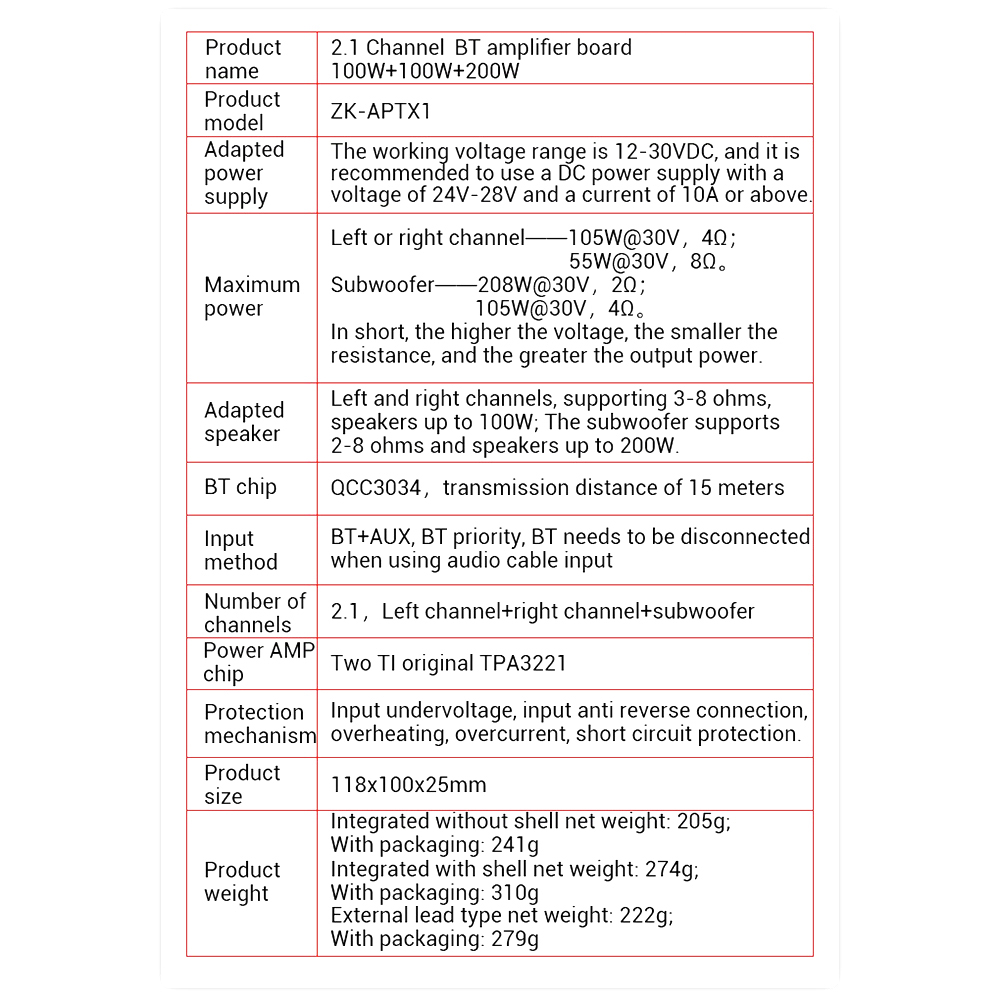 Adaptable speakers: Left and right channel, support 3-8 ohm, within 100W; subwoofer support 2-8 ohm, within 200W.
