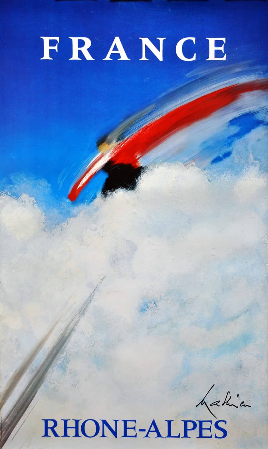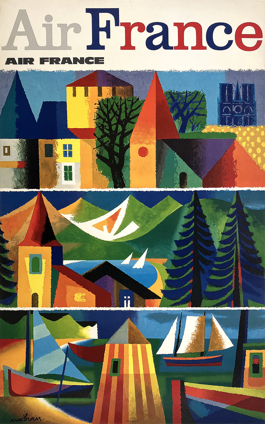 In the post-World War ll era, Air France was rapidly expanding its routes for commercial air travel. This expansion was heavily promoted by the effective use of original posters created by great artists of the era. In this clever design created by Jean Carlu, we see various destinations that Air France services throughout Europe. It is a graphic menu of enticing regions for people to visit. This poster for Air France was created by the French graphic designer Jean Carlu (1900-1997). Carlu originally began training as an architect but turned to commercial art after an accident in which he lost his right arm. In 1919 he started his career as a poster artist, becoming a leading figure in French poster design. His posters started in the Art Deco style and changed with the influence of Cubism. He came to New York in 1937 to organize an exhibition at the World�s Fair, where he remained until after WWII. It was during his time in the US that he designed one of his most famous posters America�s Answer! Production. In 1953 he returned to France and continued his work as a poster designer and consultant for many companies, including Air France and Firestone France. This is an Original Vintage Poster; it is not a reproduction. This poster is conservation mounted, linen backed, and in excellent condition. We guarantee the authenticity of all of our posters.