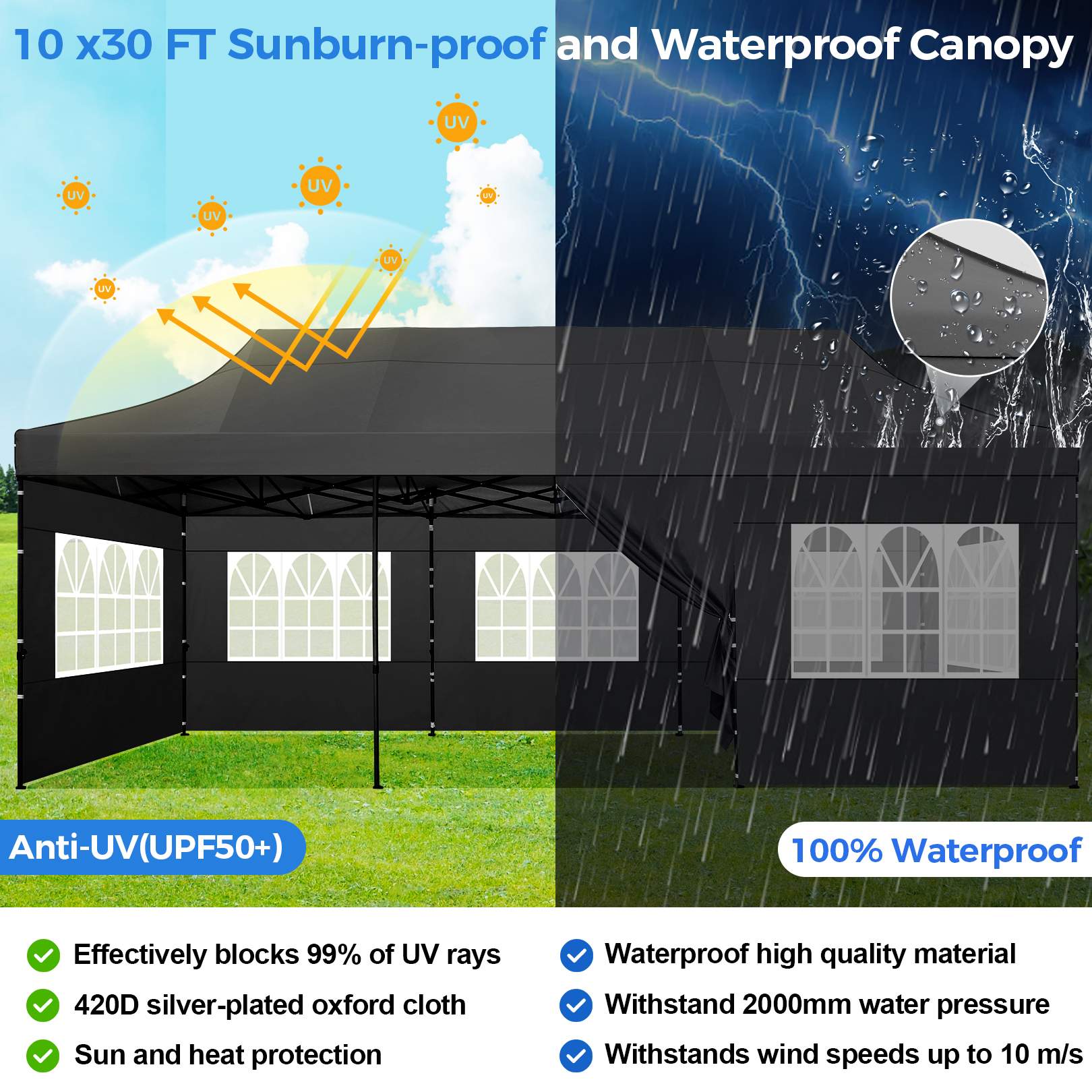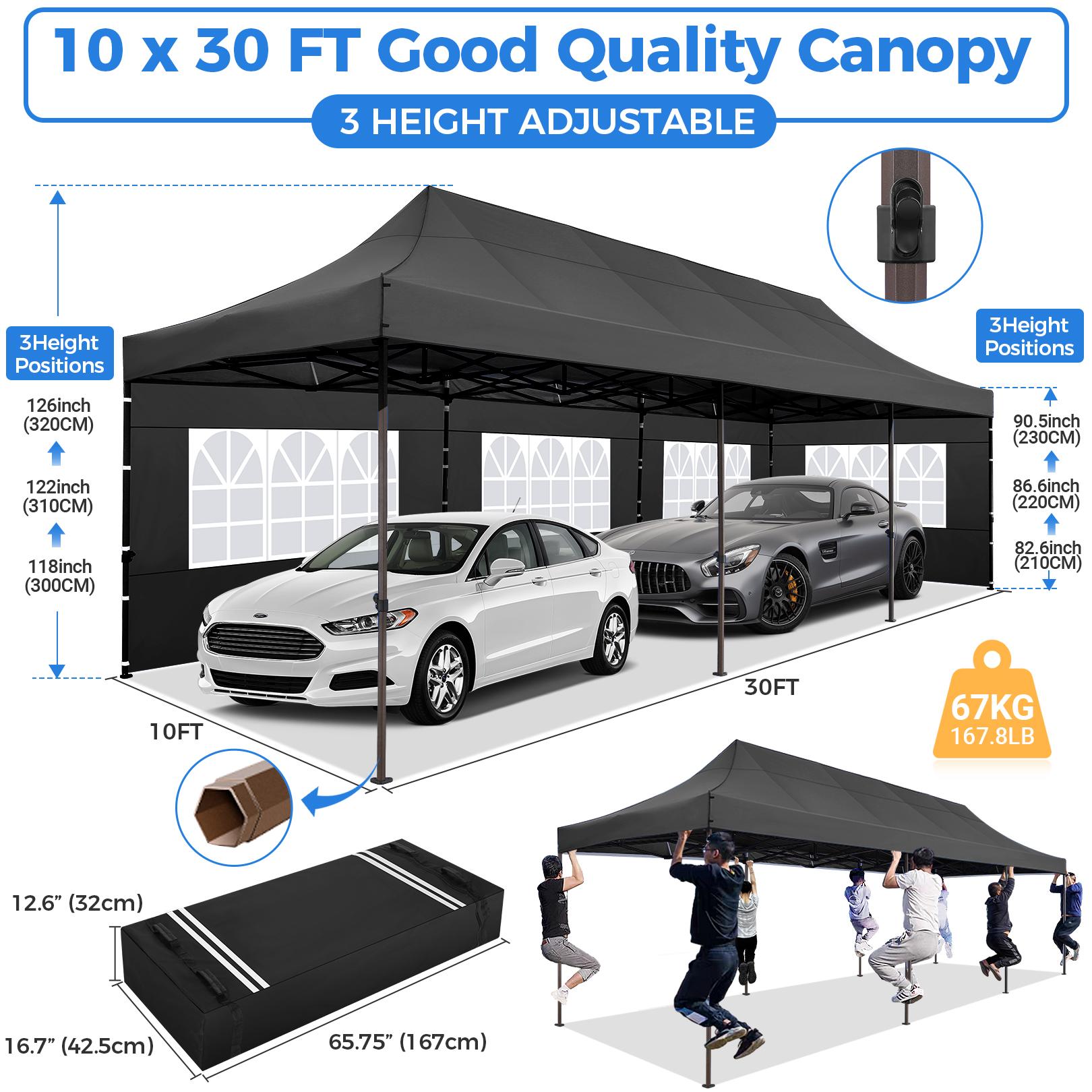 C - Heavy Duty 10x30 Party Tent, Commercial 10x30 pop up Canopy for Parties Waterproof Gazebos with 8 Sidewalls, All Season Wind & Waterproof UPF50+,Stable Thickened FrameAbout this item- Height Adjustable:118'',122", 126"