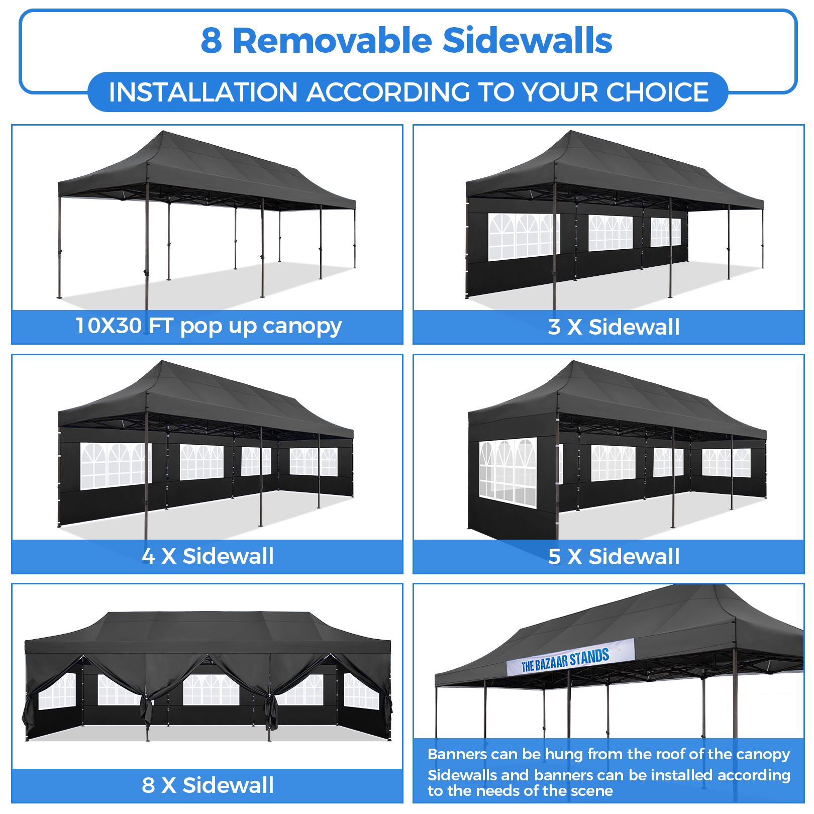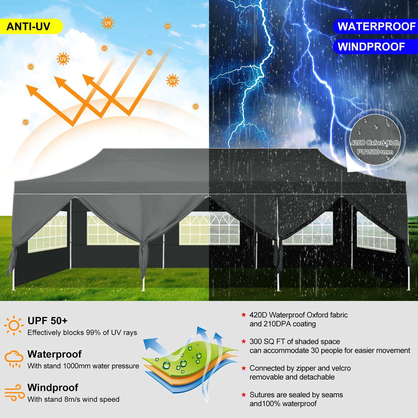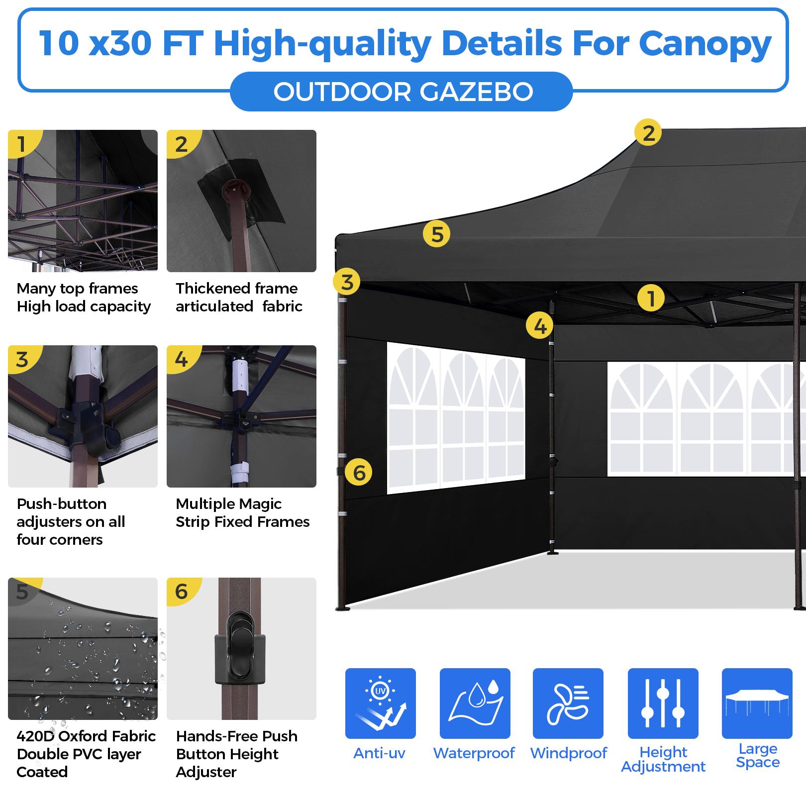 D - 10x30 Pop Up Canopy Tent for Parties, Easy Up Outdoor Gazebo Commercial Event Tent for Backyard Vendor Patio Fully Windproof & WaterproofAbout this item- BIG SIZE: The party tent size is big enough ;Outdoor Gazebo made with 8 removable sides walls with window provide the patio tent more shade. The tent can hold up to an estimated 20-30 people for dining or party. patio tent wedding tent party tent. outdoor party tent with Windows Walls + Zipper Walls, not only can the tent keep warmer but also improve air ventilation inside. Sidewalls features transparent window to enhance the brightness of interior.
