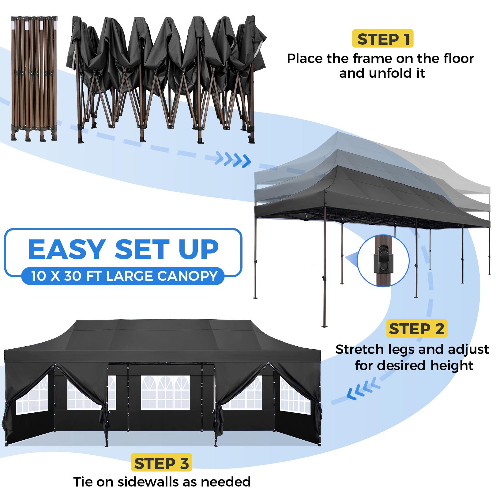 - Easy to assemble: The 10x30 pop up tent can be erected and dismantled by a team of four in mere minutes, without the need for tools. It incorporates an innovative thumb-lock mechanism for easy securing and releasing, minimizing the risk of hand injuries during setup.