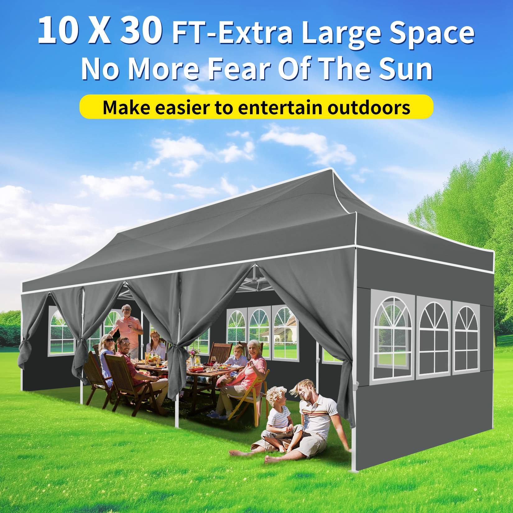 A - 10x30 Pop up Canopy Tent, Heavy Duty Party Tent Tents for Parties, Foldable UPF 50+ Waterproof Commercial Easy up Canopy with Roller Bag (Windproof Upgraded) About this item- BIG SIZE: The party tent size is big enough ;Outdoor Gazebo made with 8 removable sides walls with window provide the patio tent more shade. The tent can hold up to an estimated 20-30 people for dining or party. patio tent wedding tent party tent. outdoor party tent with Windows Walls + Zipper Walls, not only can the tent keep warmer but also improve air ventilation inside. Sidewalls features transparent window to enhance the brightness of interior.