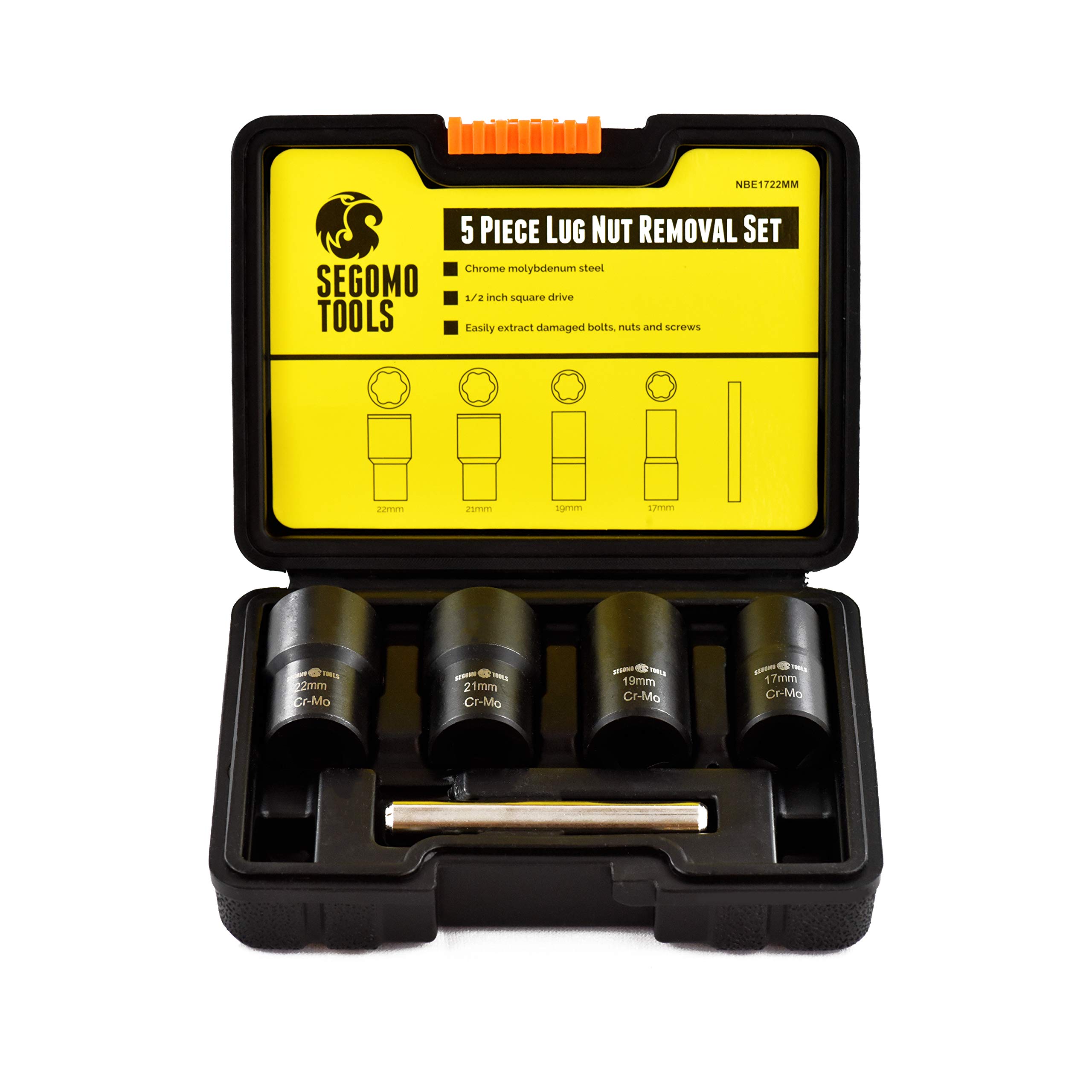 [ Every Size You Need ] This nut extractor set comes in four metric sizes: 17mm, 19mm, 21mm, 22mm and a metal rod to tap/knock the bolt out of the extractor once the bolt is removed.