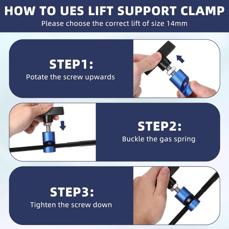 Wide application - Pack of 2 Car Hood Clamps can be used on the hood, tailgate or hatch struts of most cars, especially in cold weather. The hood prop clamp is designed to fit for 14mm lift support and keep you from potential injury.