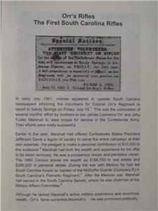 On 20 July 1861, James Lawrence Orr organized the First South Carolina Rifle Regiment at Sandy Springs. He was later elected Colonel. First posted to Sullivan Island, South Carolina, to defend Charleston Harbor, the unit transferred to Robert E. Lee’s Army of Northern Virginia in April 1862 where it was incorporated into Gregg’s Brigade of General A.P. Hill’s Light Division of “Stonewall” Jackson’s Corps.