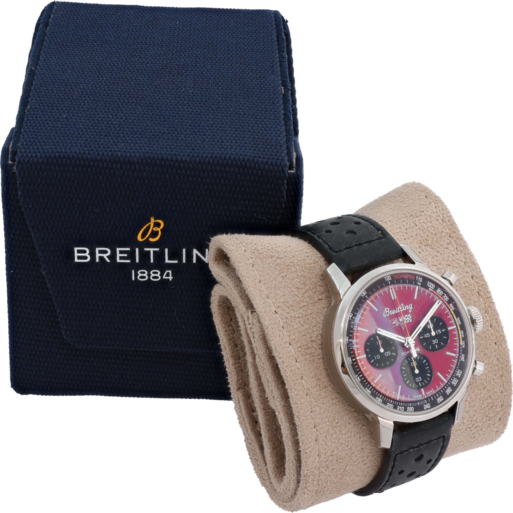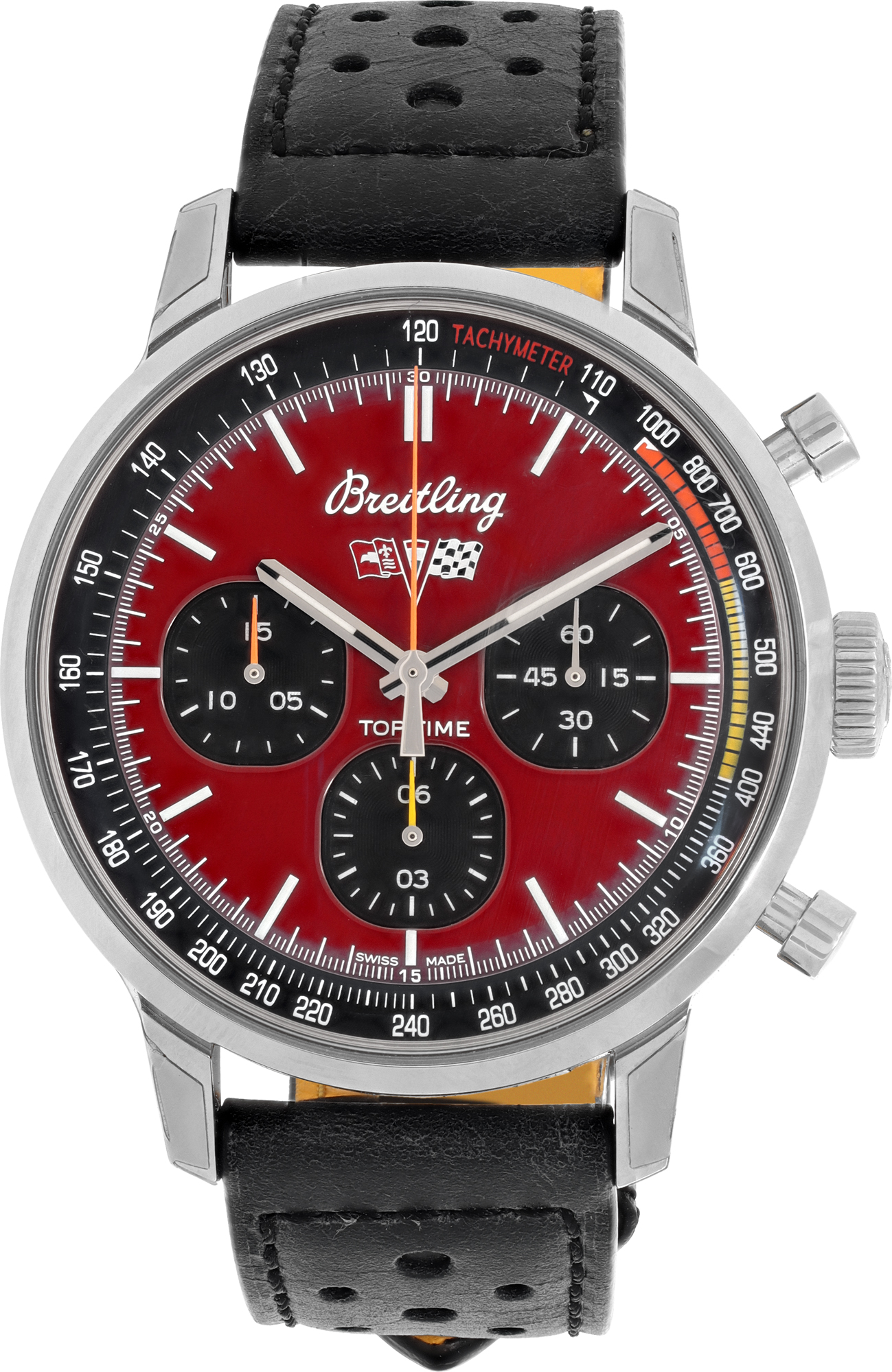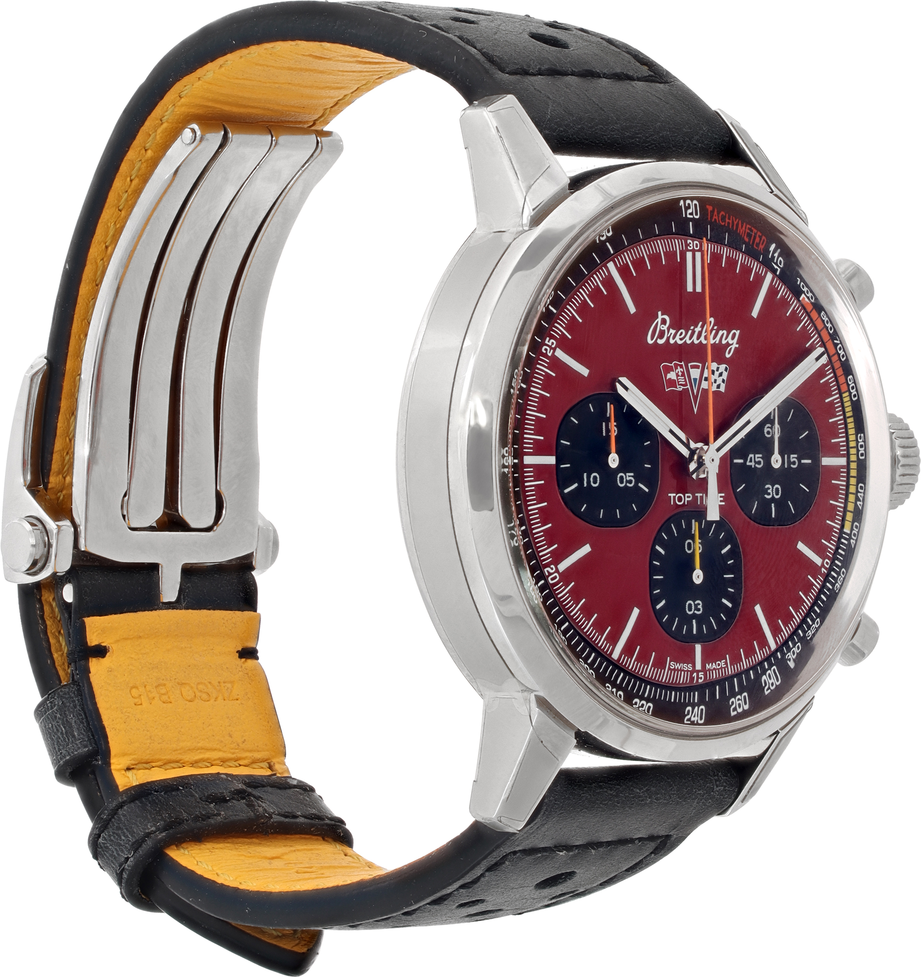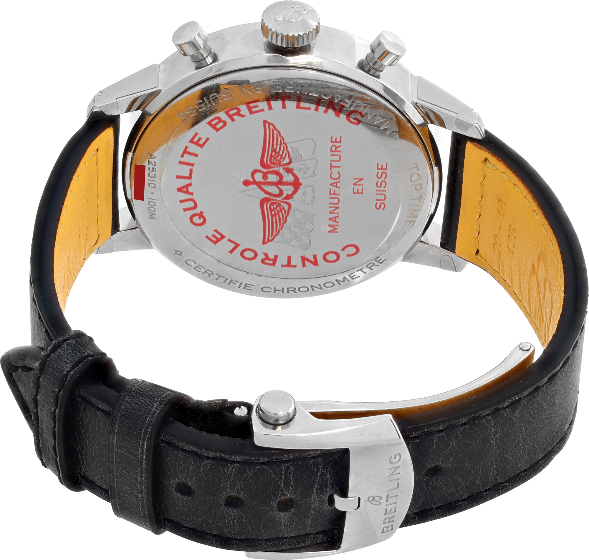 Breitling Top Time in stainless steel on leather strap and a stainless steel deployment. Auto w/ chronograph. 42 mm case size. With box, boooklets and papers. Ref A25310. Fine Pre-owned Breitling Watch.