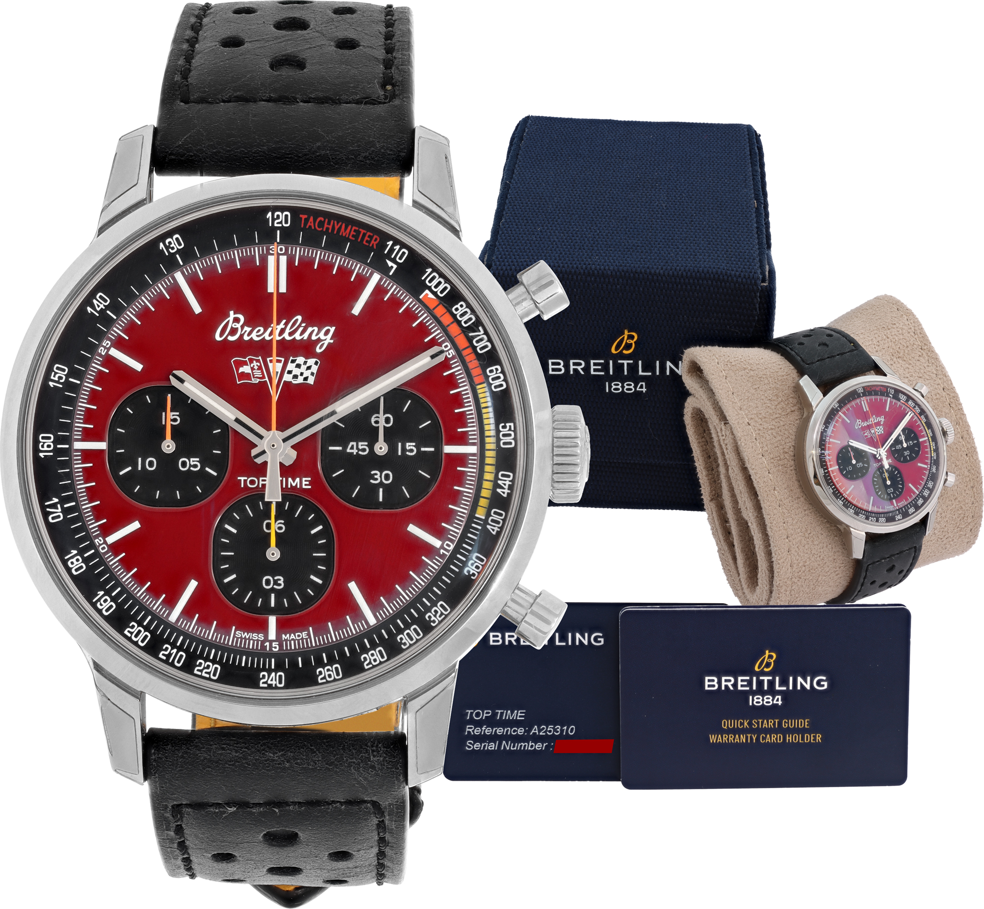 Certified Pre-owned Sport Breitling Top Time A25310 watch is made out of Stainless steel on a Black Leather strap with a Stainless Steel Deployant buckle. This Breitling watch has a 42 x 42 mm case with a Round case back and Red Stick dial. It is Gray and Sons Certified Pre-Owned and comes backed by our 12-month warranty. Each watch is inspected by our in-house watchmakers before shipment including final servicing, cleaning, and polishing, if needed.
