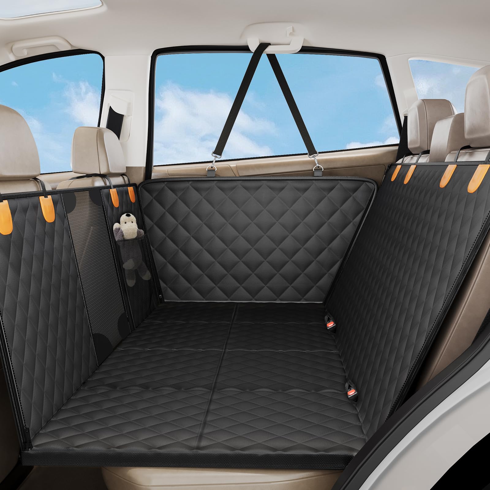Fully Waterproof & Easy to Clean: Upgraded with a 6-layer protective structure, the top surface of this dog car seat cover features a water-resistant coating applied through advanced hot-pressing technology. Completely free of pinholes, it effectively blocks liquids and stains from seeping into your car seats. Cleanup is easy: wipe, vacuum, or rinse with water.