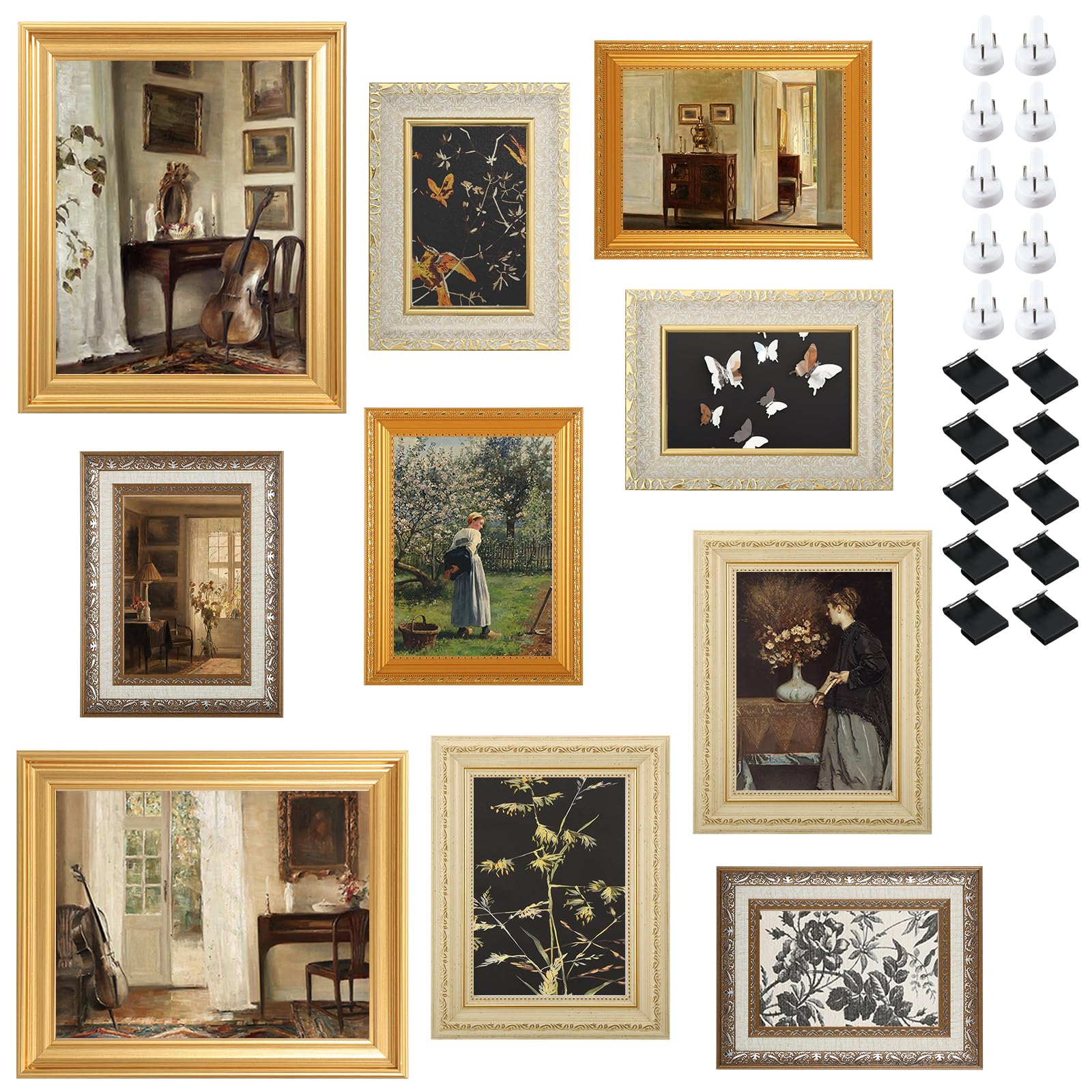 This set of 10 vintage French farmhouse picture frame set offers versatile Picture Frame with various sizes, wall hooks, and tabletop stands. Made from durable materials with glass covers, they protect and showcase your photos beautifully. Perfect for decorating bedrooms, living rooms, offices, or galleries, these elegant frames add timeless charm and easy style to any space.
