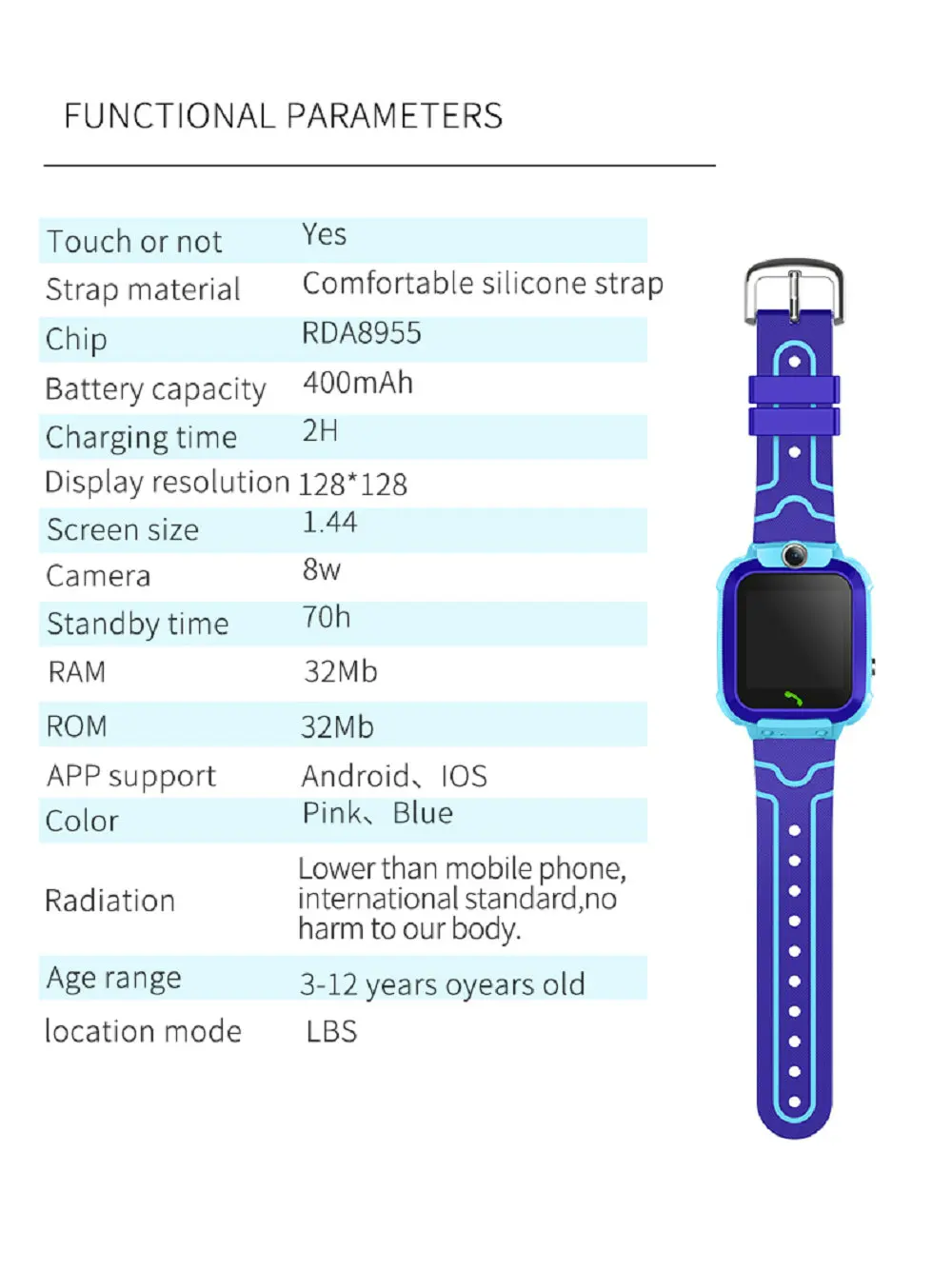 Chip: PDA8955Batteriekapazität: 400mAhLadezeit: 2HDDisplayauflösung: 128*128Displaygröße: 1.44inchFarbe: Princess Powder, Knight BlueStrahlung: niedriger als Mobiltelefone, internationale Standards, keine Auswirkungen auf den menschlichen KörperAnwendbares Alter: 3-12 Jahre altPositionierungsmethode: präzise Positionierung + Positionierung der Basisstation