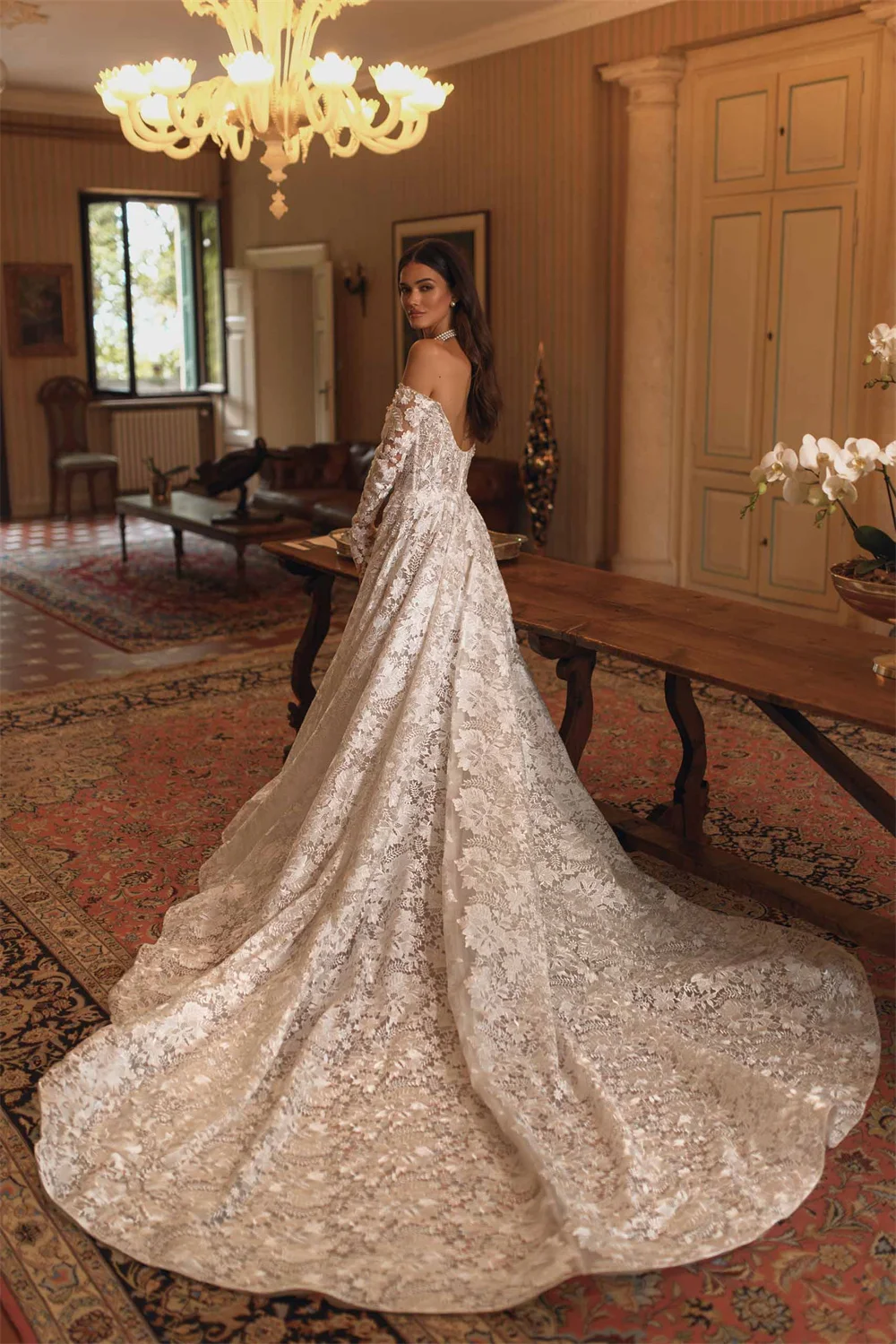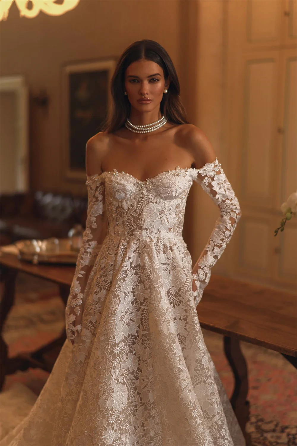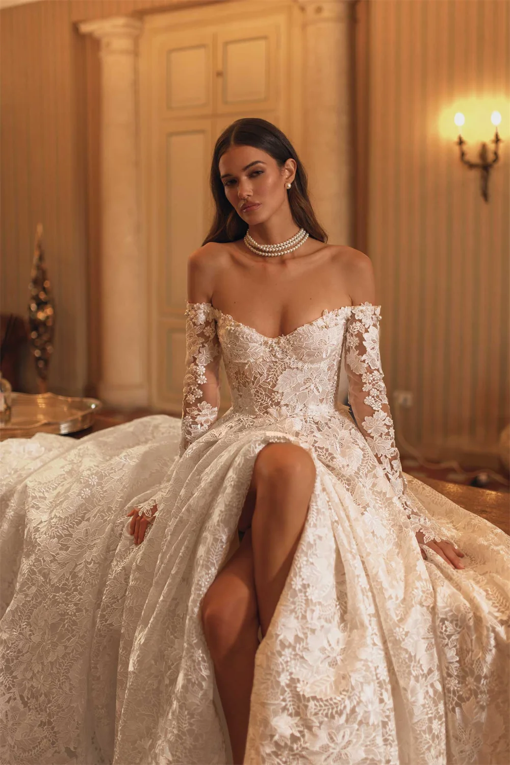 Off-Shoulder Lace Wedding Dress Long Sleeve Sweetheart Bridal Gown with Train
