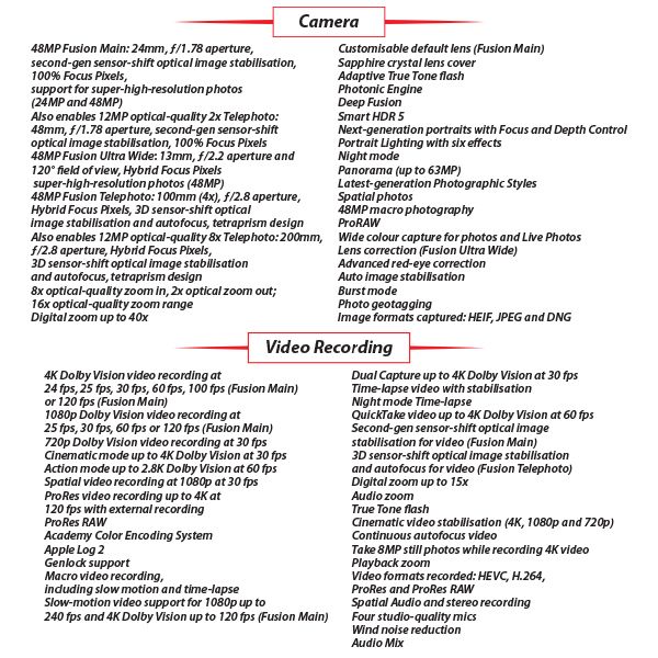- Pro Fusion Camera System: Triple 48MP array including a 100mm periscope telephoto lens for 8x optical-quality zoom.