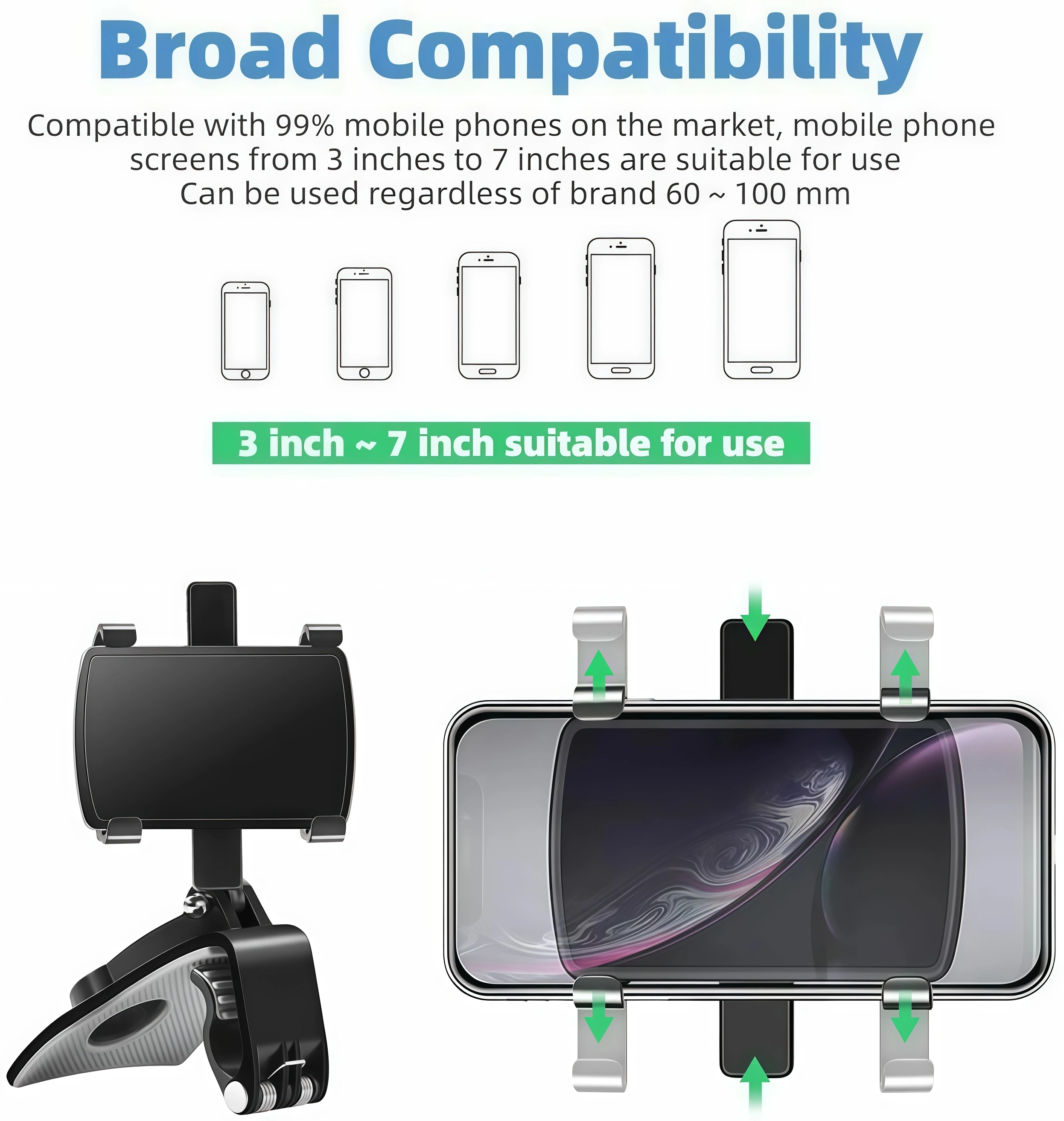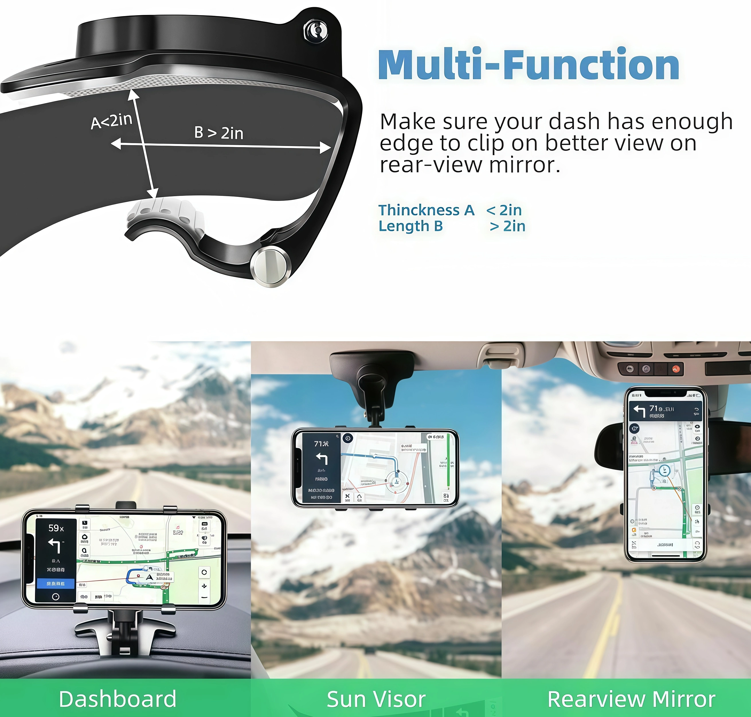 One Car Holder For Multiple Purposes: This clip car mount more convenient, can be used in car dashboard, sun visor, rearview mirror. Multiple purposes can provide you with more convenience and more use needs in the car.