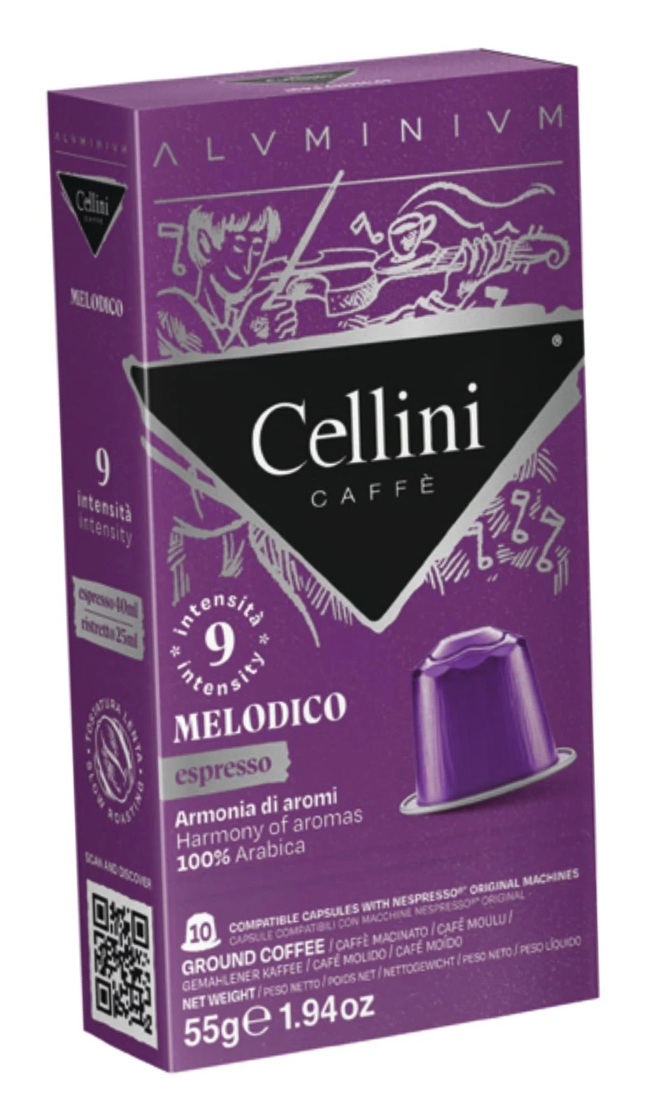Prova l'aroma ricco e il sapore intenso delle capsule di caffè in alluminio Cellini, compatibili con le macchine Nespresso. Ogni capsula è riempita con il 10% in più di caffè, garantendo un risultato perfetto in tazza. La miscela Melodico è un mix armonioso di caffè 100% Arabica provenienti dall'America centrale e dalla Colombia, che offre una deliziosa nota di cacao e un livello di intensità 9. Le capsule in alluminio proteggono il caffè dagli agenti esterni, preservando la freschezza e sono riciclabili all'infinito.