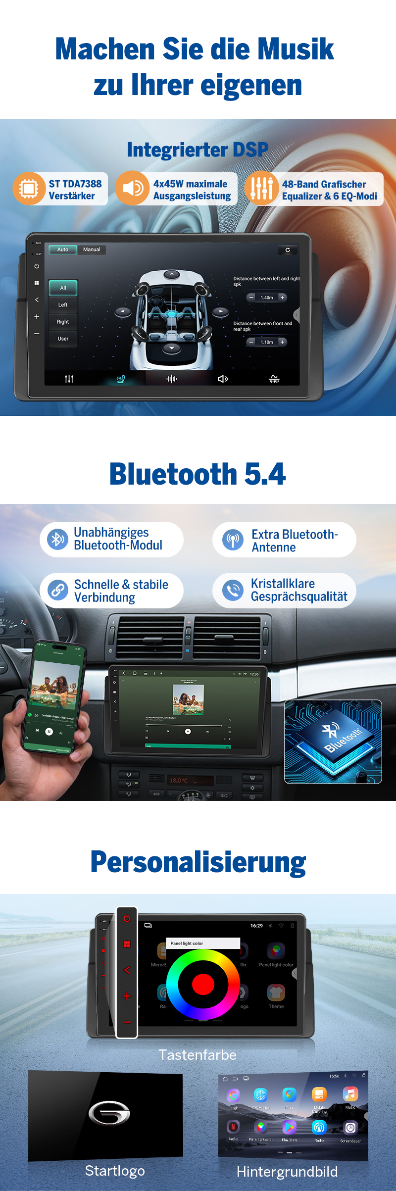 Das Eonon E46X7 Android 14 Autoradio ist die ideale Wahl für BMW-E46-Fahrer, die ein kompatibles, fahrzeugspezifisches Android 14 Autoradio mit Wireless CarPlay, Android Auto kabellos, hochwertigem DSP-Sound, großem Touchscreen und vollständiger OEM-Integration suchen. Technisch ausgereift, werksnah im Design und optimal für den anspruchsvollen deutschen Markt im Mittel- bis Premiumsegment.