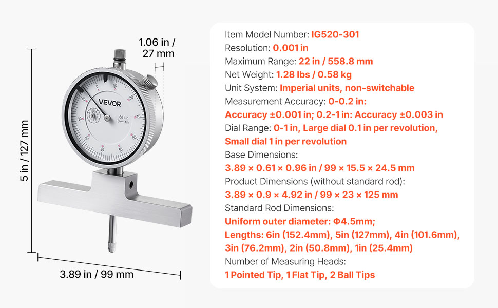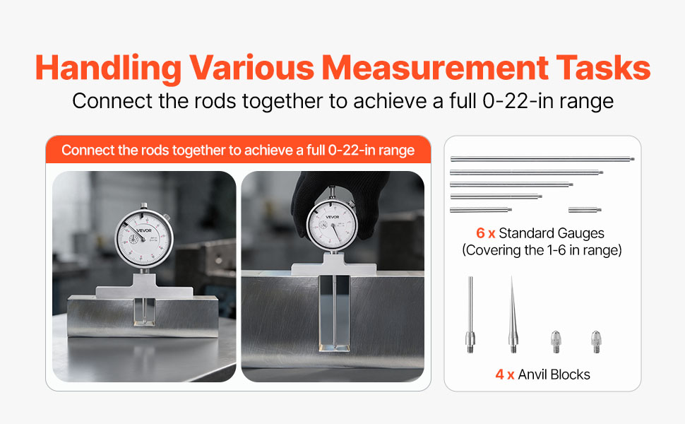 Versatile Measurement Tasks: This depth gauges include four anvils to suit different workpieces. Six calibration rods can be combined for a 0–22 in range, ideal for measuring metal sheets, grooves, and other depths, meeting professional metalworking needs