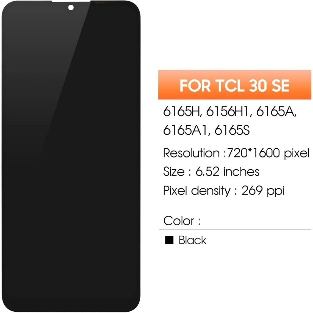 Specifically designed for TCL 30 SE models including 6165H, 6156H1, 6165A, 6165A1, 6165S (applicable for the LCD replacement black screen assembly with frame). |