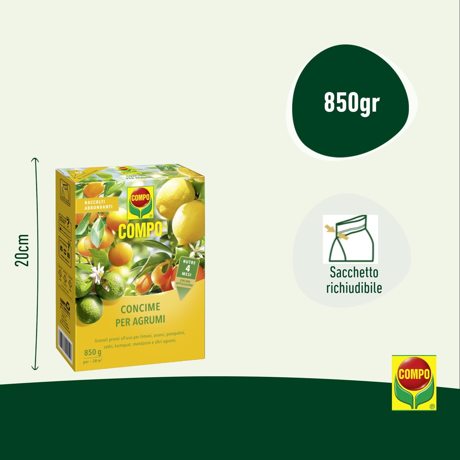 Concime minerale per agrumi, Ideale per limoni, aranci, pompelmi, cedri, kumquat, mandarini e lime, Nutre fino a 4 mesi con una sola applicazione - Alto contenuto di azoto a lenta cessione per la crescita di piante sane e forti, Fosforo e potassio per lo sviluppo dei frutti, Ferro e magnesio per la colorazione verde delle foglie, Mix di microlementi per fioriture intense e prolungate - Granuli sferici pronti all'uso che non lasciano residui su vasi e guanti, Facili da distribuire con il misurino in carta incluso - Periodo d'impiego e dosaggi consigliati riportati sulla confezione, Sufficiente 1 applicazione per coprire il fabbisogno stagionale della pianta, Confezione 100% riutilizzabile - Contenuto: 1x Cartone di COMPO Concime per Agrumi, Incluso misurino in carta, Peso: 850 g