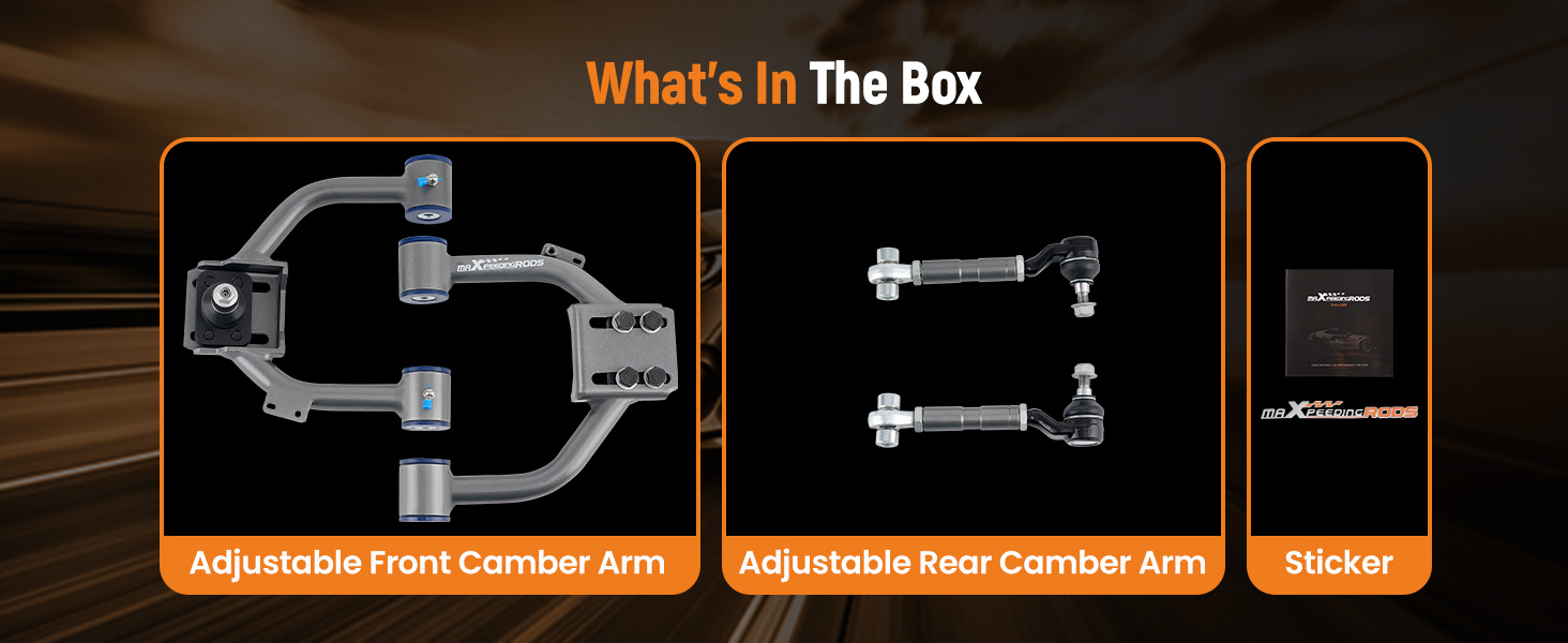 - The Camber kit is made from High Tensile Strength Steel, and powder coating to prevent rust and corrosion, ensuring long-lasting durability.