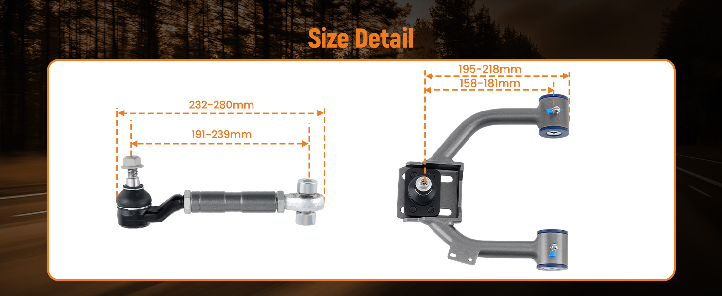 | Eye-to-Eye Length Range | (Front Camber)158-181mm; (Rear Camber)191-239mm |
