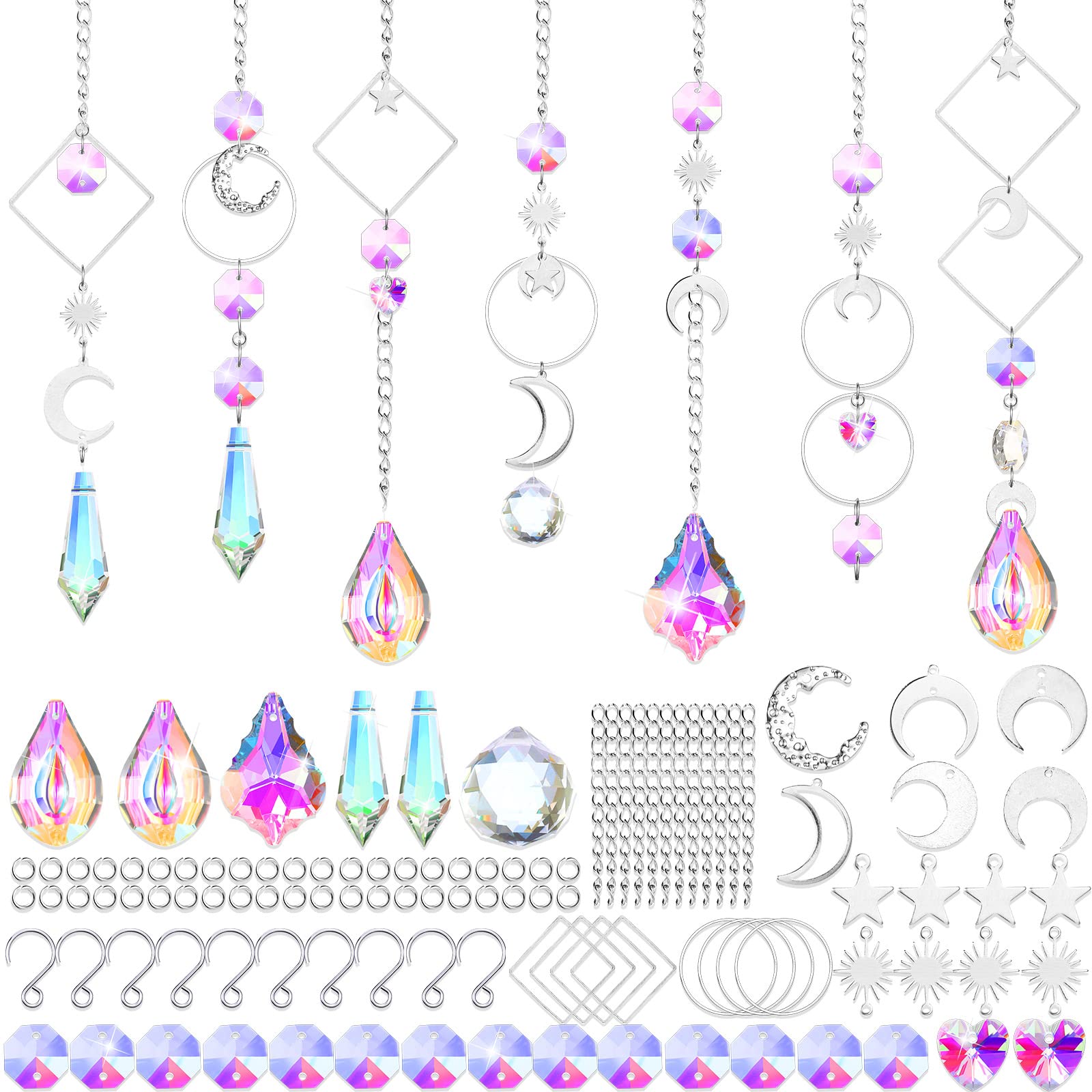 - Specific Content: there are 2 pieces 38 mm AB crystal beads, 1 piece 20 mm crystal ball, 2 pieces 38 mm pointed AB crystal beads, 1 piece maple leaf shaped crystal, 2 pieces heart shaped AB crystal beads, 14 pieces octagonal beads, 23 pieces metal hanging decors (7 pieces are moon shape, 4 pieces are sun shape, 4 pieces are round shape, 4 pieces are square shape, 4 pieces are star shape), 10 pieces 25 mm S shaped hooks, 1 pack (100 pieces) silver chain, 1 pack (200 pieces) silver circle links