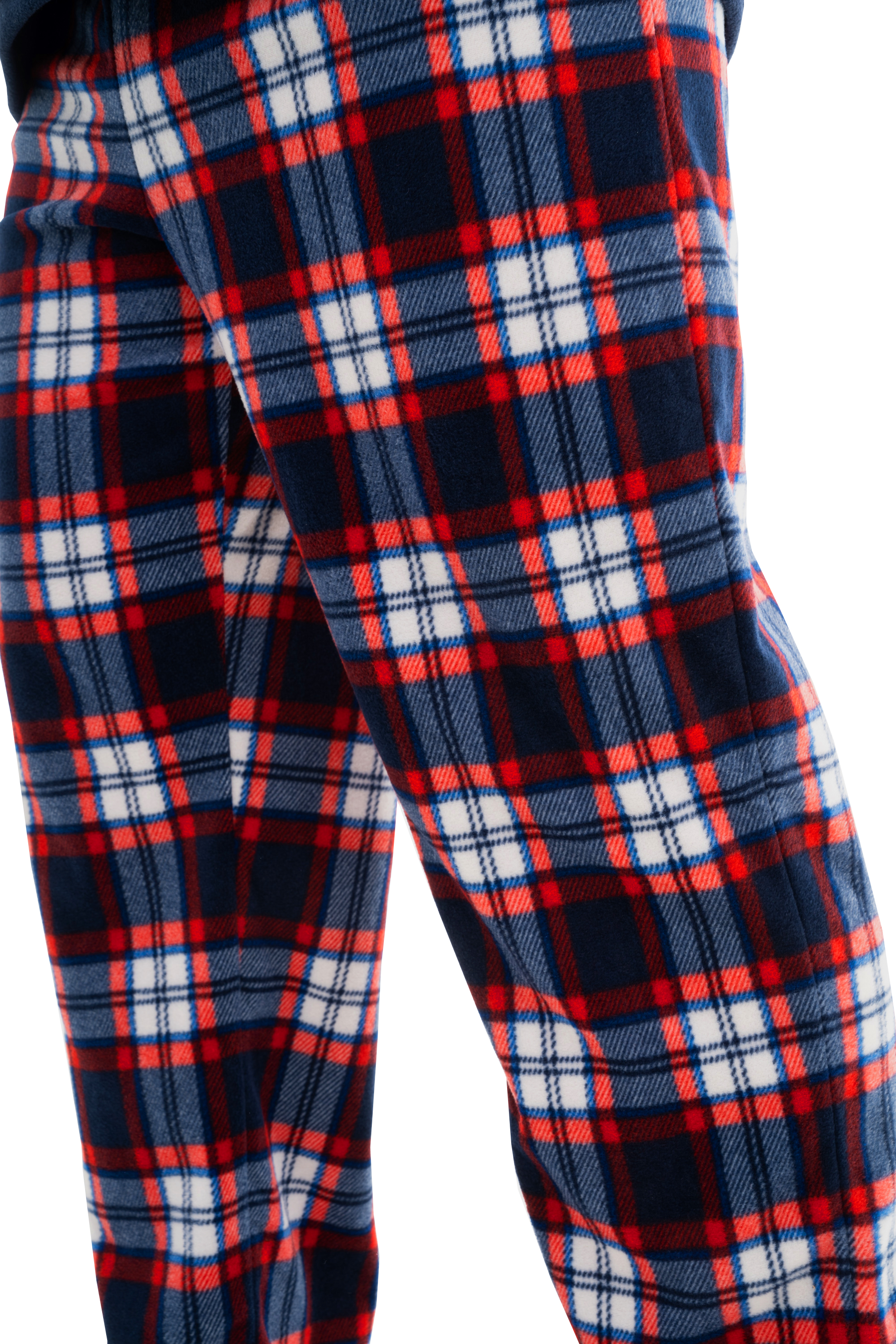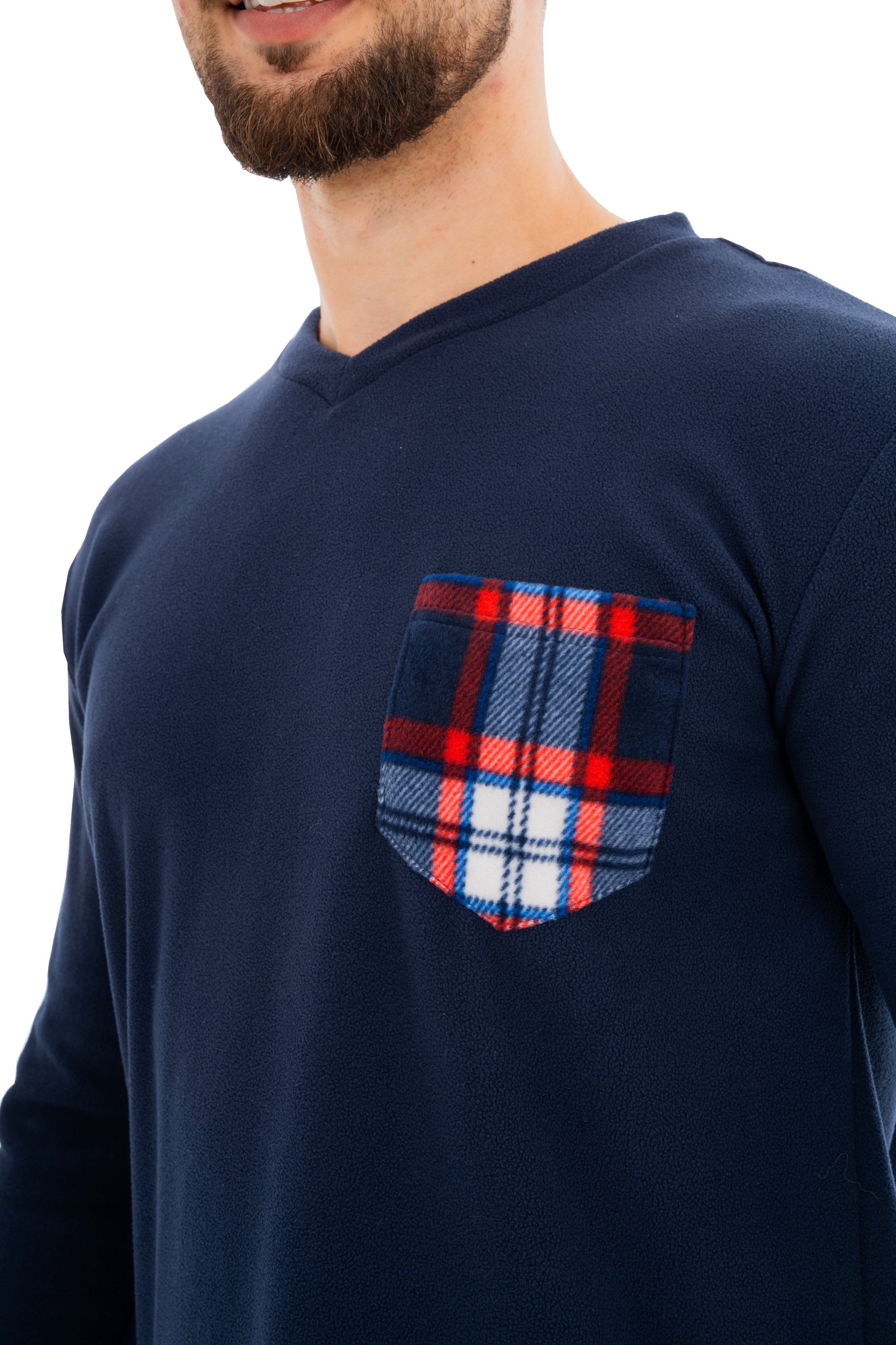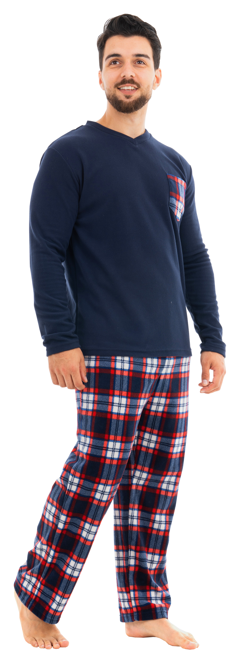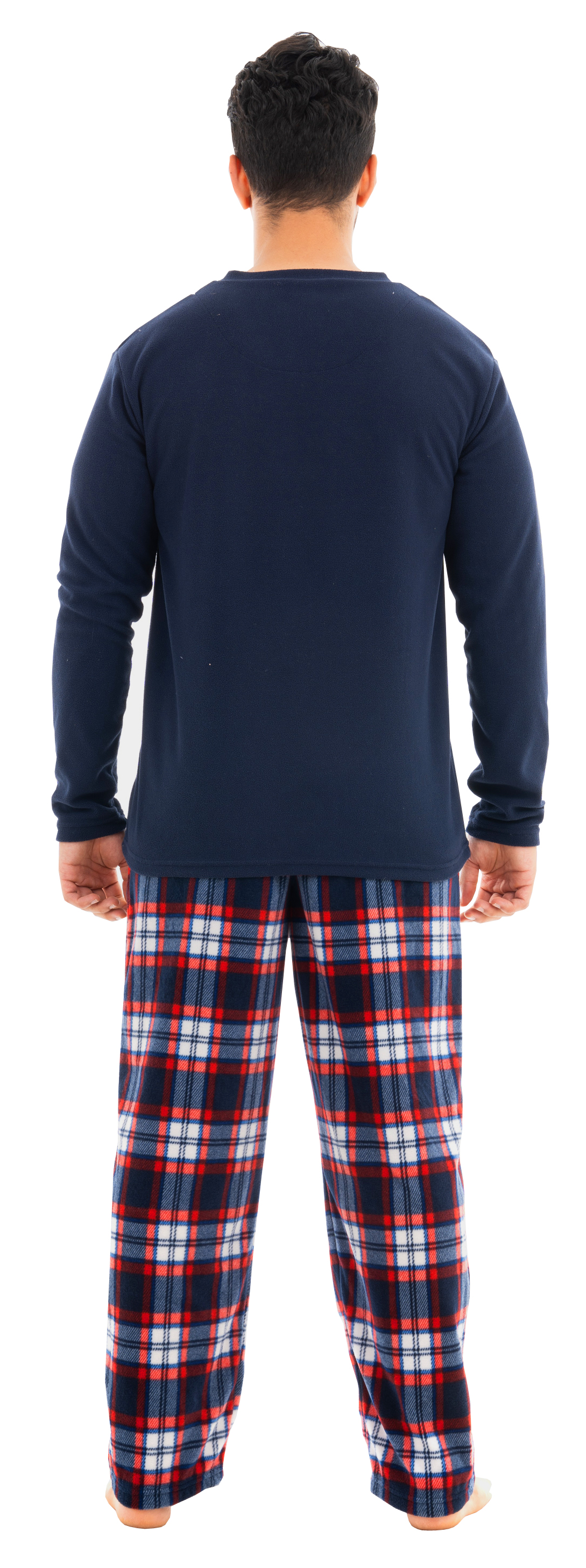 Enjoy a restless night's sleep with our brand new men's fleece men's pyjama set from the Harvey James collection. Made from 100% Polyester, you can count on these pjs to wick any moisture from your body during a hot night. Other material attributes include being: super soft to the touch, highly durable, quick drying and very easy to wash.The elasticated waistband gives these pants just the right amount of stretch that will mean bottoms that won't fall down yet pants that aren't too tight around the waist. The long sleeve shirt is ideal for all seasons, expect peak performance in both winter and summer.