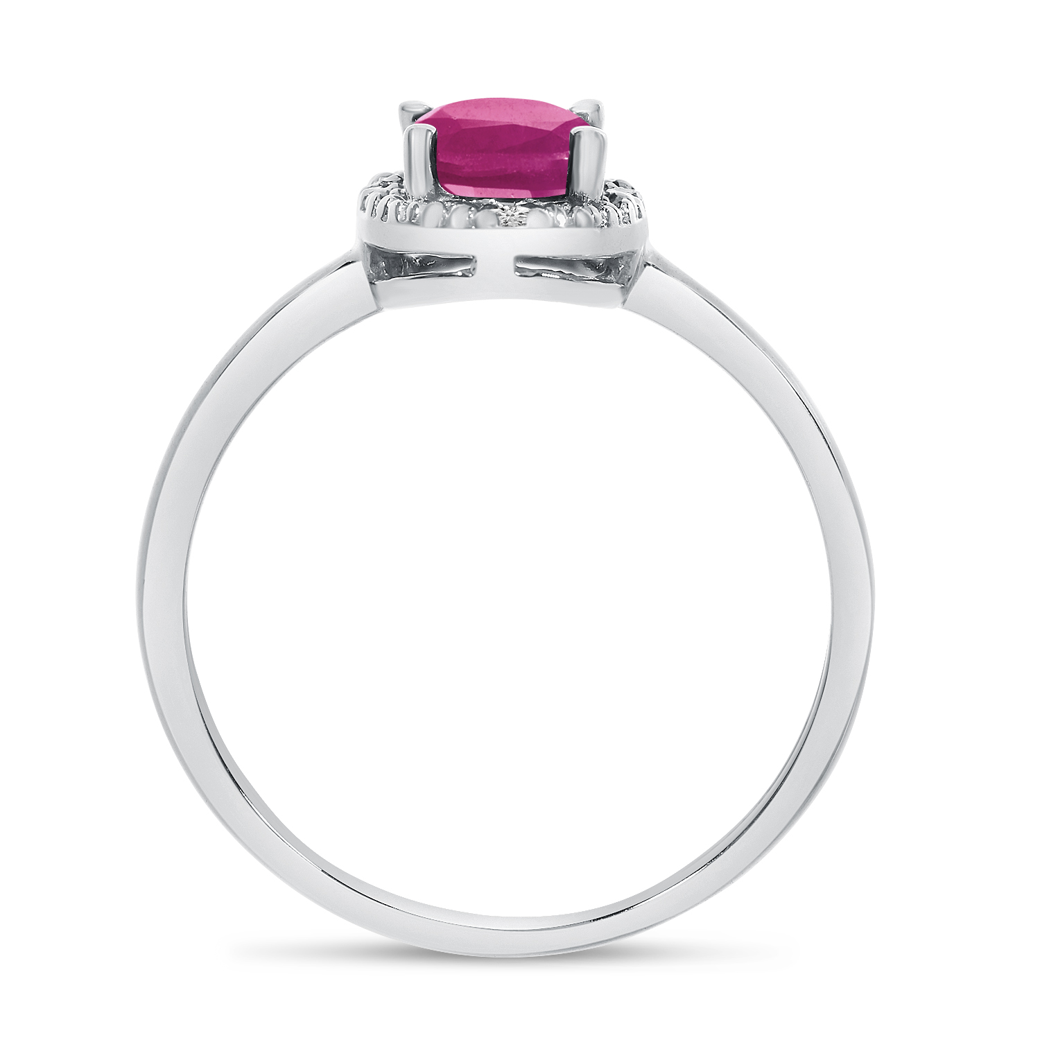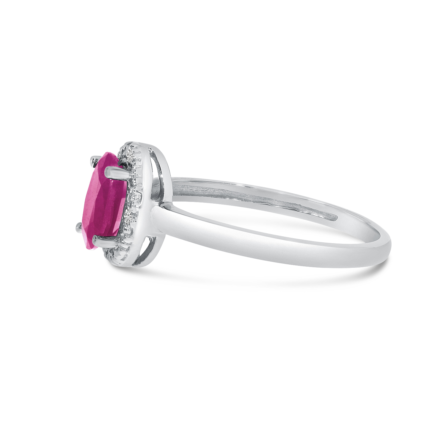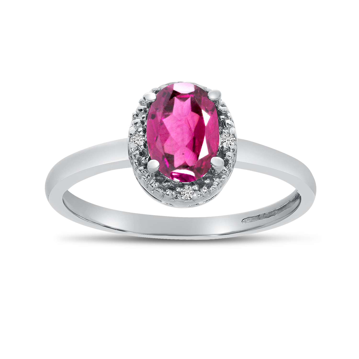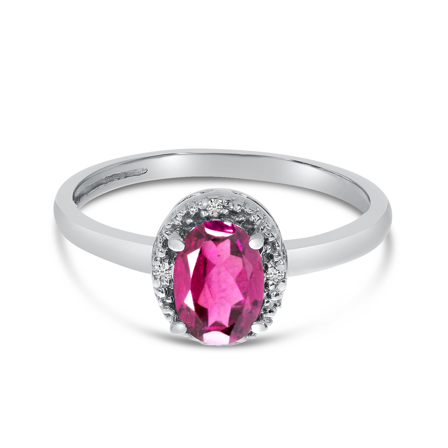 This 14k white gold oval pink topaz and diamond ring features a 7x5 mm genuine natural pink topaz with a 0.83 ct total weight.